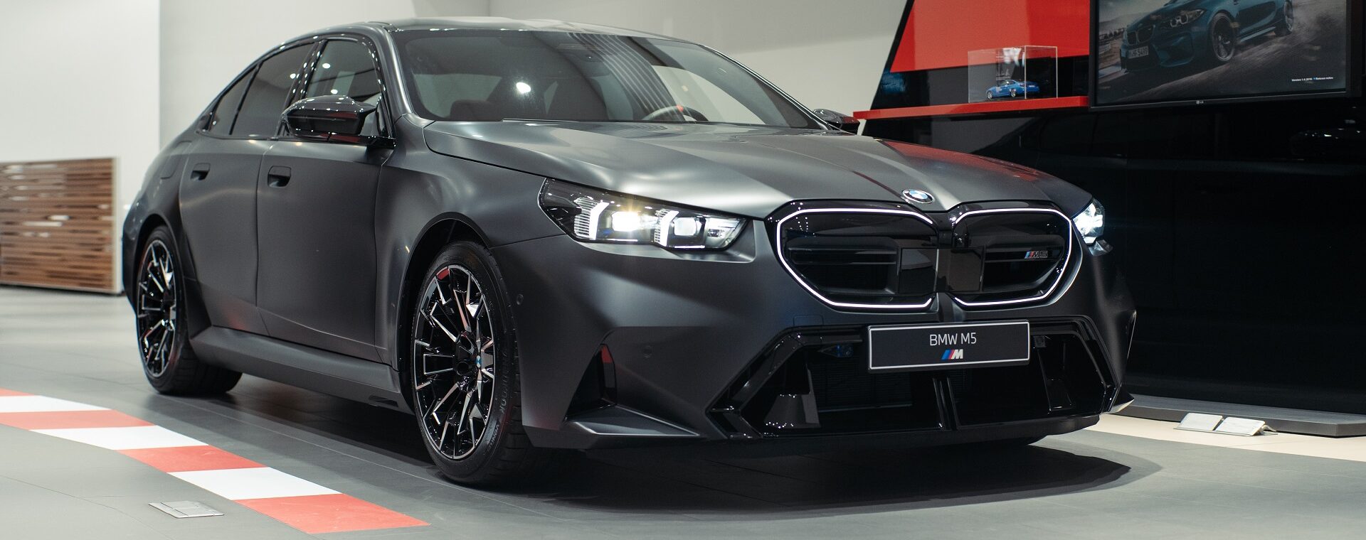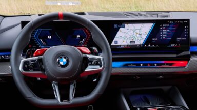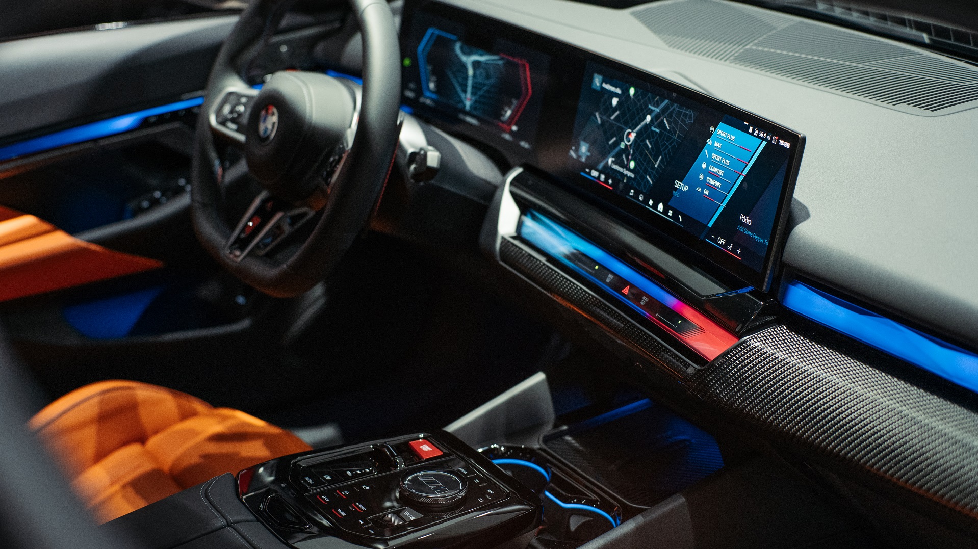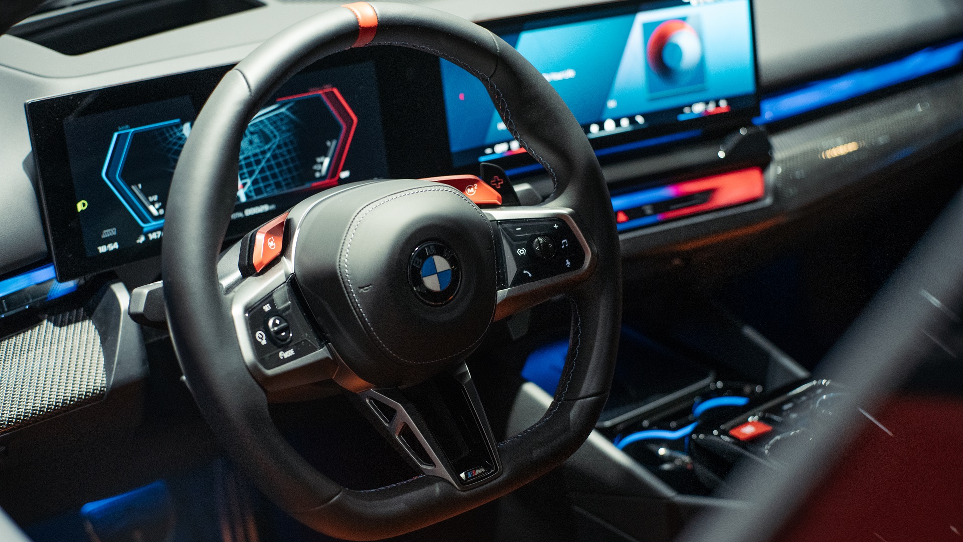 Εκτός από το ειδικό για μοντέλα M πάνελ ελέγχου στην κεντρική κονσόλα, το πρωτοποριακό cockpit της νέας BMW M5 περιλαμβάνει επίσης ένα νέας σχεδίασης δερμάτινο τιμόνι M με επίπεδο κάτω τμήμα και φωτιζόμενα πλήκτρα, μπάκετ καθίσματα πολλαπλών λειτουργιών M και φυσικά την κυρτή οθόνη BMW Curved Display.