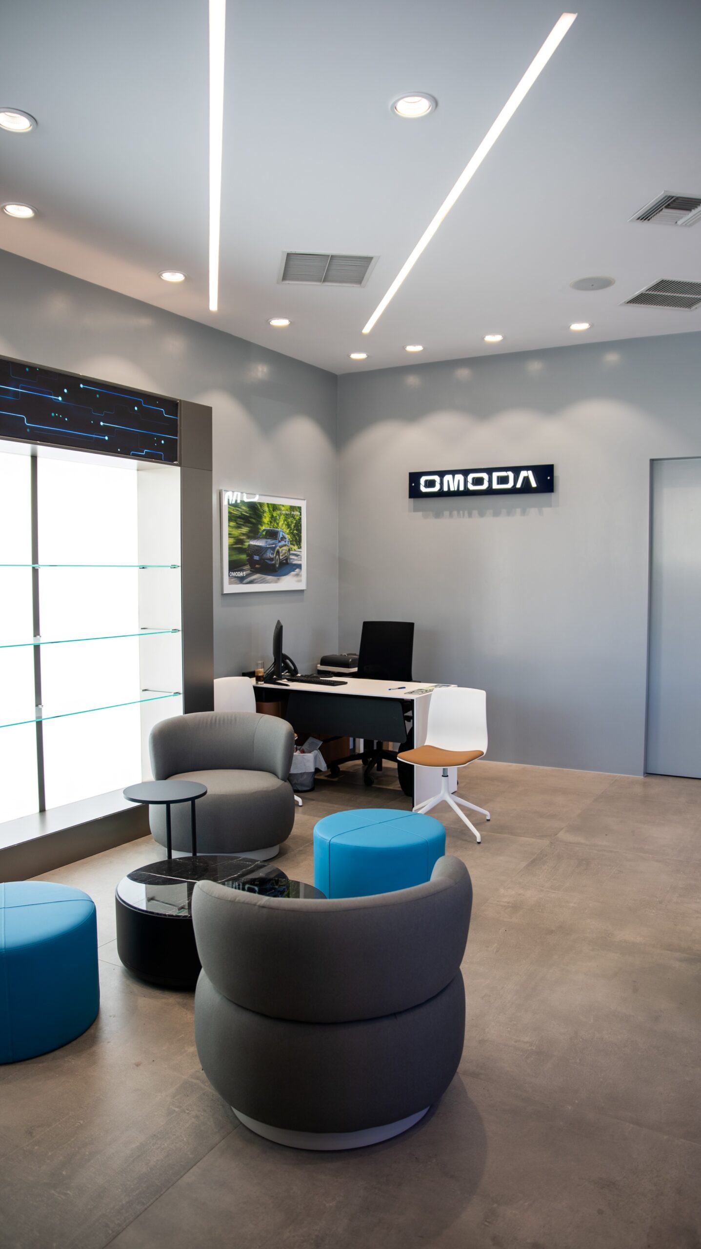 Οι χώροι υποδοχής έχουν σχεδιαστεί με έμφαση στη σύγχρονη αισθητική και το διαφοροποιημένο ύφος κάθε brand. Η JAECOO δίνει έμφαση στην πολυτέλεια και την κλασική κομψότητα, με φυσικά υλικά και γήινες αποχρώσεις. Αντίθετα, η OMODA προτάσσει μια πιο τεχνολογικά προσανατολισμένη, μίνιμαλ προσέγγιση με μοντέρνα υλικά και φωτισμό LED.