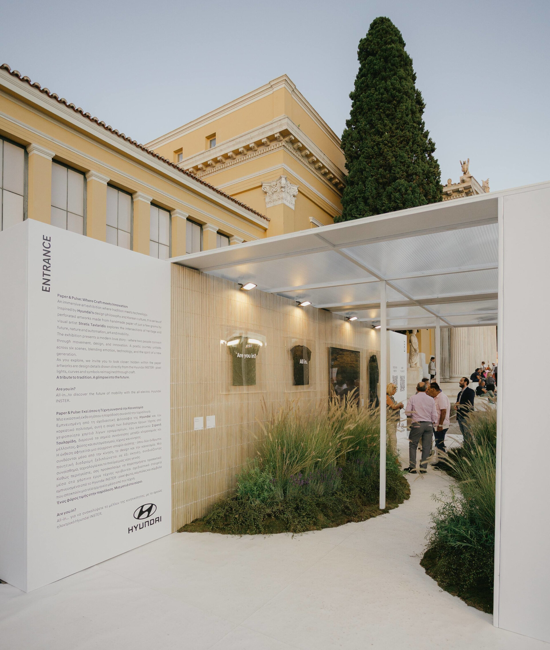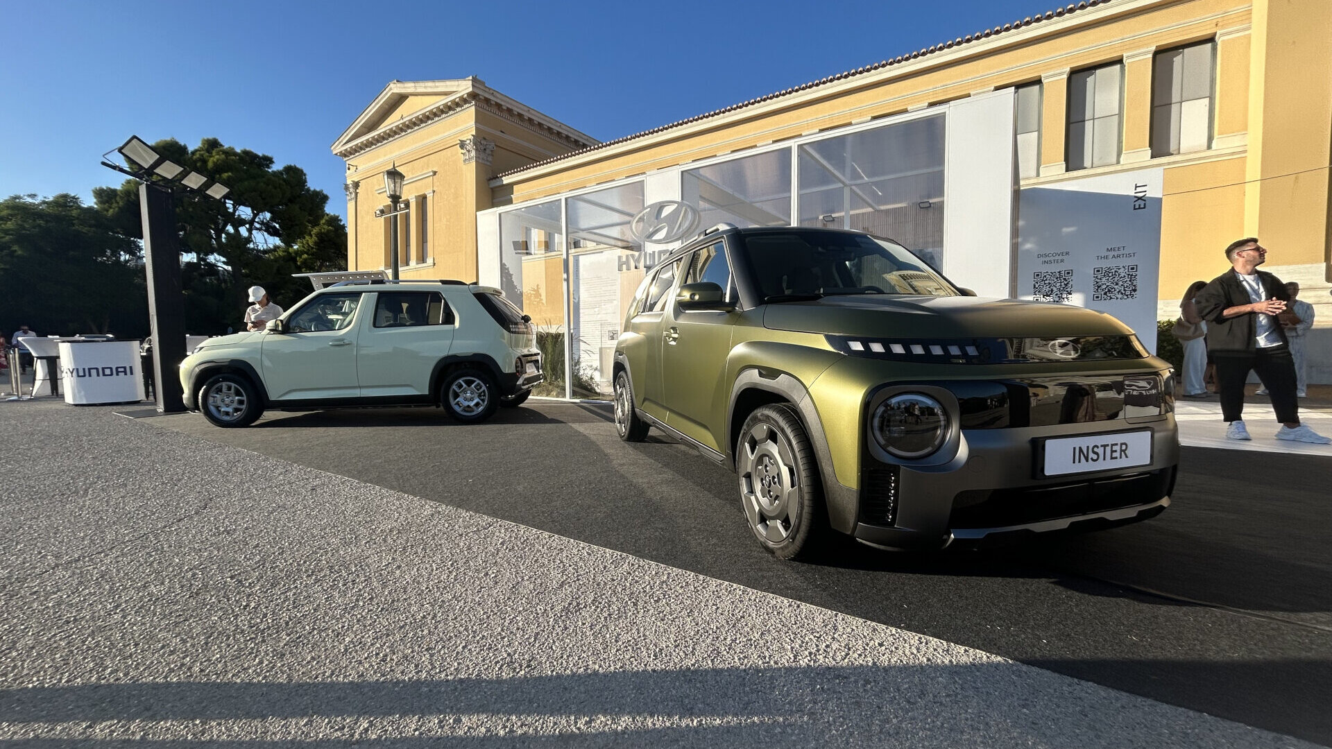 Τα αμιγώς ηλεκτρικά Hyundai Inster και Inster Cross, κοσμούν τον ειδικά διαμορφωμένο χώρο της εταιρείας, ολοκληρώνοντας τον διάλογο ανάμεσα στην παράδοση και την καινοτομία, τη φύση και την τεχνολογία, την Ανατολή και τη Δύση.