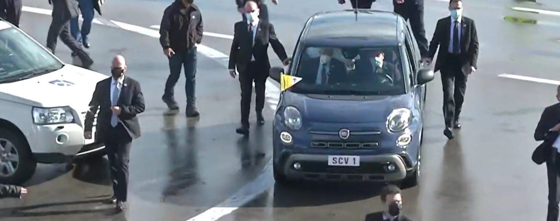 Όπως συνηθίζεται, ο Ποντίφικας δεν χρησιμοποιεί θωρακισμένες λιμουζίνες για τις μετακινήσεις του, αλλά ένα απλό αυτοκίνητο. Στη συγκεκριμένη περίπτωση ένα ευρύχωρο Fiat 500L, το οποίο έχει την πινακίδα που τοποθετείται σε κάθε αυτοκίνητο που μεταφέρει τον Πάπα: SCV1. Πρόκειται για τη συντομογραφία του λατινικού Status Civitatis Vaticanae, που σημαίνει Κράτος της Πόλης του Βατικανού.