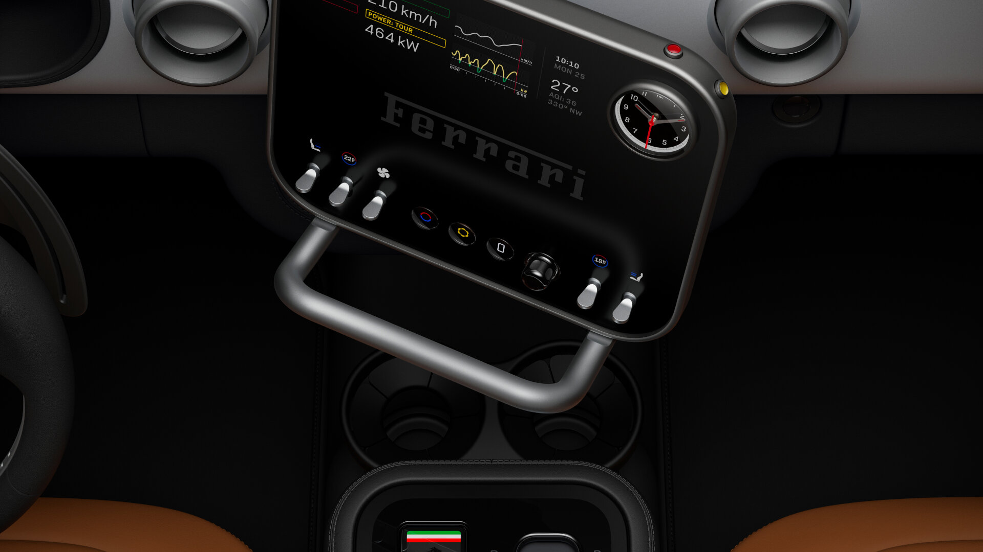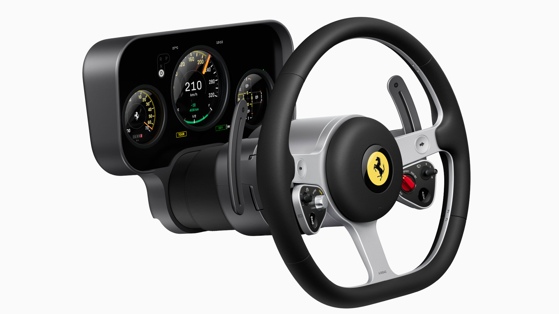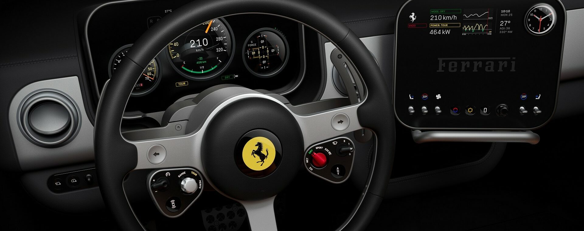 Ένα από τα πιο χαρακτηριστικά στοιχεία είναι το τιμόνι, που κατασκευάζεται από κατεργασμένο αλουμίνιο, και φιλοξενεί δύο απλές αναλογικές ομάδες κουμπιών σε κάθε ακτίνα. Η αισθητική του τιμονιού έρχεται σε αντίθεση με τα πολυάριθμα ψηφιακά χειριστήρια των προηγούμενων Ferrari, προσφέροντας μια πιο λιτή, απτή και «αναλογική» εμπειρία για τον οδηγό. Το τιμόνι εμπνέεται από τα κλασικά μοντέλα Nardi των δεκαετιών του 1950 και 1960, αλλά επαναπροσδιορίζεται με υλικά υψηλής τεχνολογίας και εξαιρετική ακρίβεια κατασκευής.
