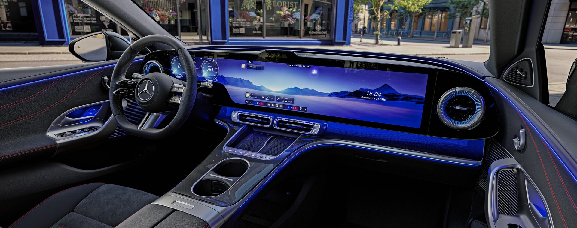 Τα βλέμματα τραβά φυσικά η νέα, τεράστια MBUX Hyperscreen. Πρόκειται για ένα ενιαίο πάνελ οθόνης που καλύπτει από άκρη σε άκρη όλο το ταμπλό – αντίστοιχο με αυτό που είδαμε και στην ολοκαίνουργια GLC τον Σεπτέμβριο του 2025.