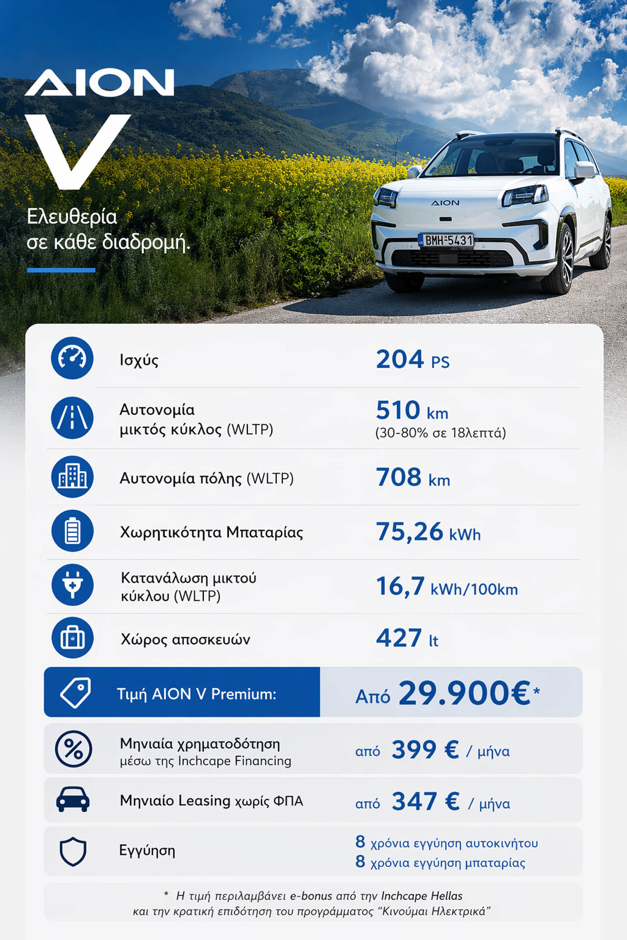 Τόσο για το Αion V, όσο και το Αion UT ισχύει η 8ετής εγγύηση οχήματος και μπαταρίας, ενισχύοντας το αίσθημα ασφάλειας και αξιοπιστίας για τον οδηγό.