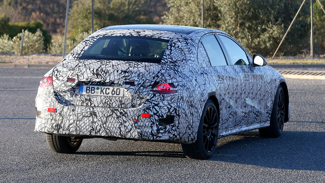 Το πίσω μέρος φαίνεται να συνεχίζει την οικογενειακή εικόνα, αν και το σχήμα των φωτιστικών σωμάτων δεν διακρίνεται καθαρά. Μπορούμε να δούμε το εσωτερικό της καμπίνας των επιβατών, αλλά το ταμπλό είναι πολύ καμουφλαρισμένο. Ωστόσο, αναμένουμε ότι η σχεδίαση του δανείζεται πολλά στοιχεία της S-Class, συμπεριλαμβανομένης της μεγάλης κάθετης κεντρικής οθόνης αφής και του μεγάλου ψηφιακού πίνακα οργάνων.