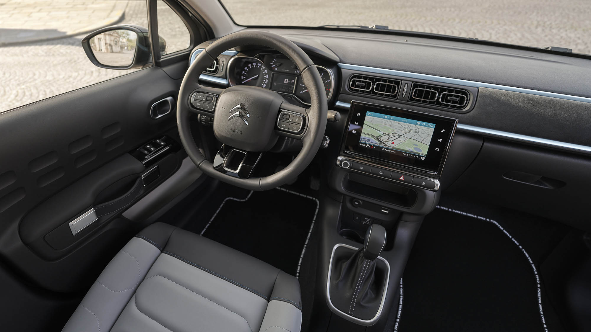 Οι ματ ασημί μπλε λεπτομέρειες συνεχίζονται στο εσωτερικό και το C3 Elle είναι εξοπλισμένο με καθίσματα Advanced Comfort της Citroen με επένδυση από ανοιχτό γκρι ύφασμα και Alcantara. Διαθέτουν επίσης σατινέ μπλε ανταύγειες στις πλάτες και υπάρχει το λογότυπο και το μότο της Elle στα πατάκια. Το επενδυμένο με Alcantara ταμπλό είναι επίσης μοναδικό για το νέο μοντέλο.