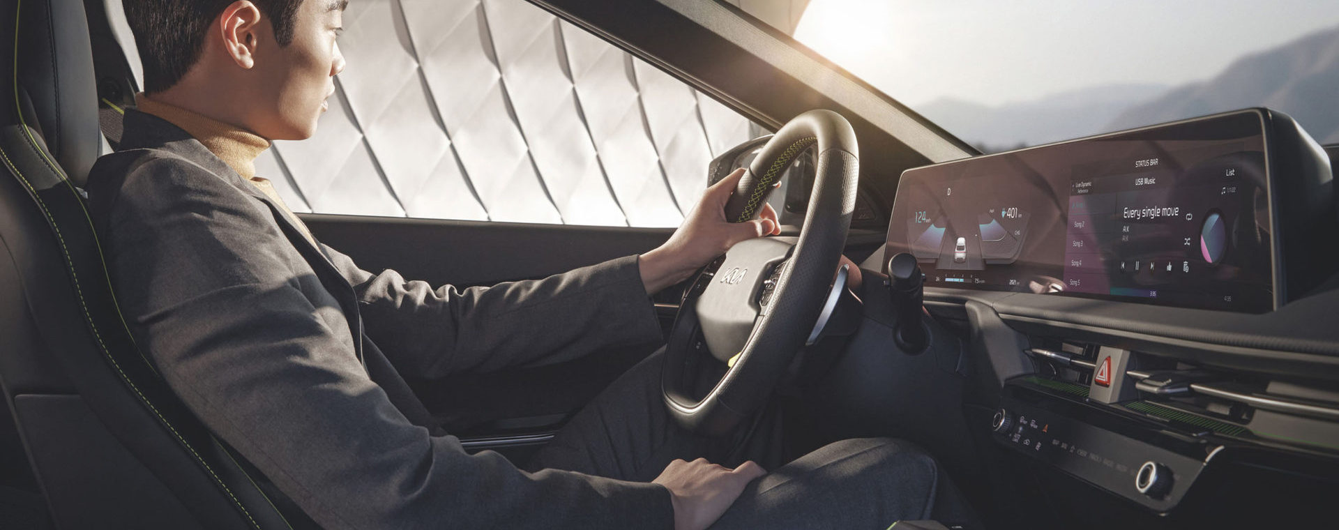 Το EV6, το πρώτο ηλεκτρικό Kia που βασίζεται στην πλατφόρμα E-GMP, δεν ξεχωρίζει μόνο για τις επιδόσεις, την μεγάλη αυτονομία και την ταχύτατη φόρτιση. Ένα από τα πιο εντυπωσιακά στοιχεία του είναι η κυρτή οθόνη υψηλής ευκρίνειας για τα συστήματα ενημέρωσης, ψυχαγωγίας και πλοήγησης. Εκτείνεται από το τιμόνι προς το μέσο του αυτοκινήτου, εμφανίζει ένα πίνακα οργάνων μπροστά από τον οδηγό, καθώς και την περιοχή απεικόνισης των πολυμέσων και της πλοήγησης πάνω από την κεντρική κονσόλα.