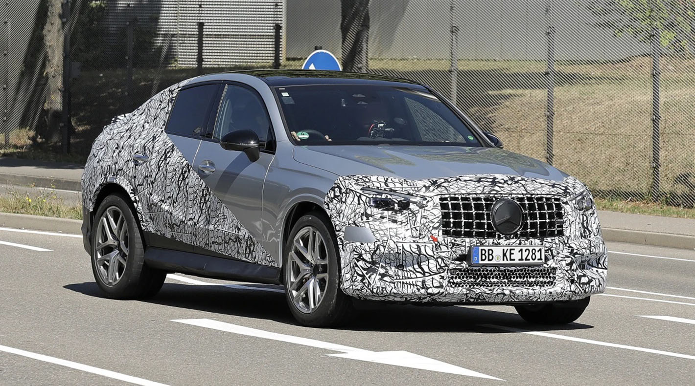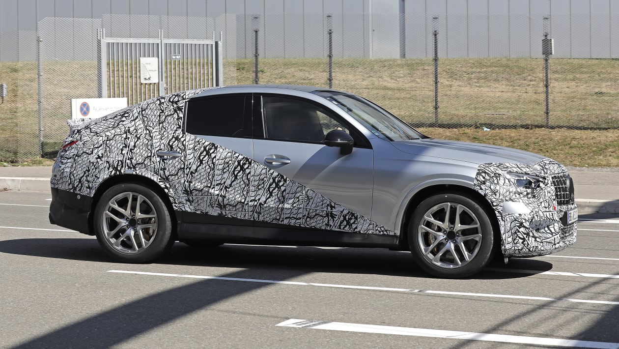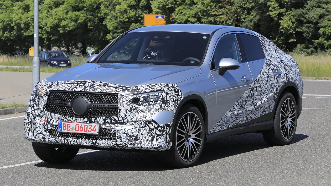 Προηγούμενες κατασκοπευτικές φωτογραφίες της GLC Coupe μας έδειξαν ότι το εμπρός μέρος της θα είναι πανομοιότυπο με αυτό της GLC, αλλά με πιο κομψά φωτιστικά σώματα που ενσωματώνονται στην μάσκα. Επίσης, εκεί φιλοξενούνται αρκετά μικρά τριάκτινα αστέρια, με το σήμα της εταιρείας, ενώ ανασχεδιασμένος είναι ο προφυλακτήρας κάτω.