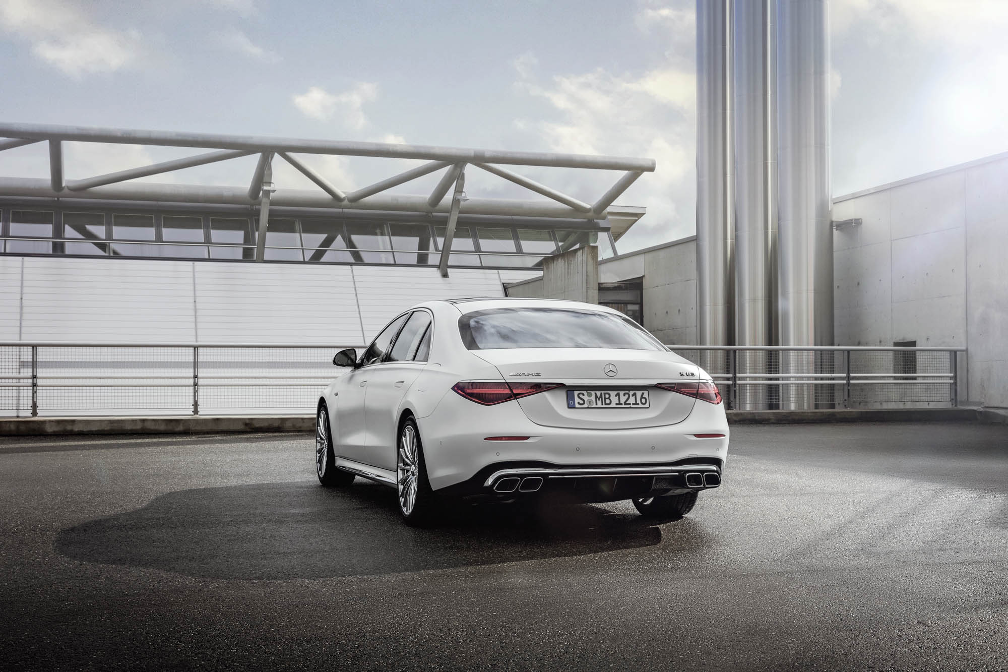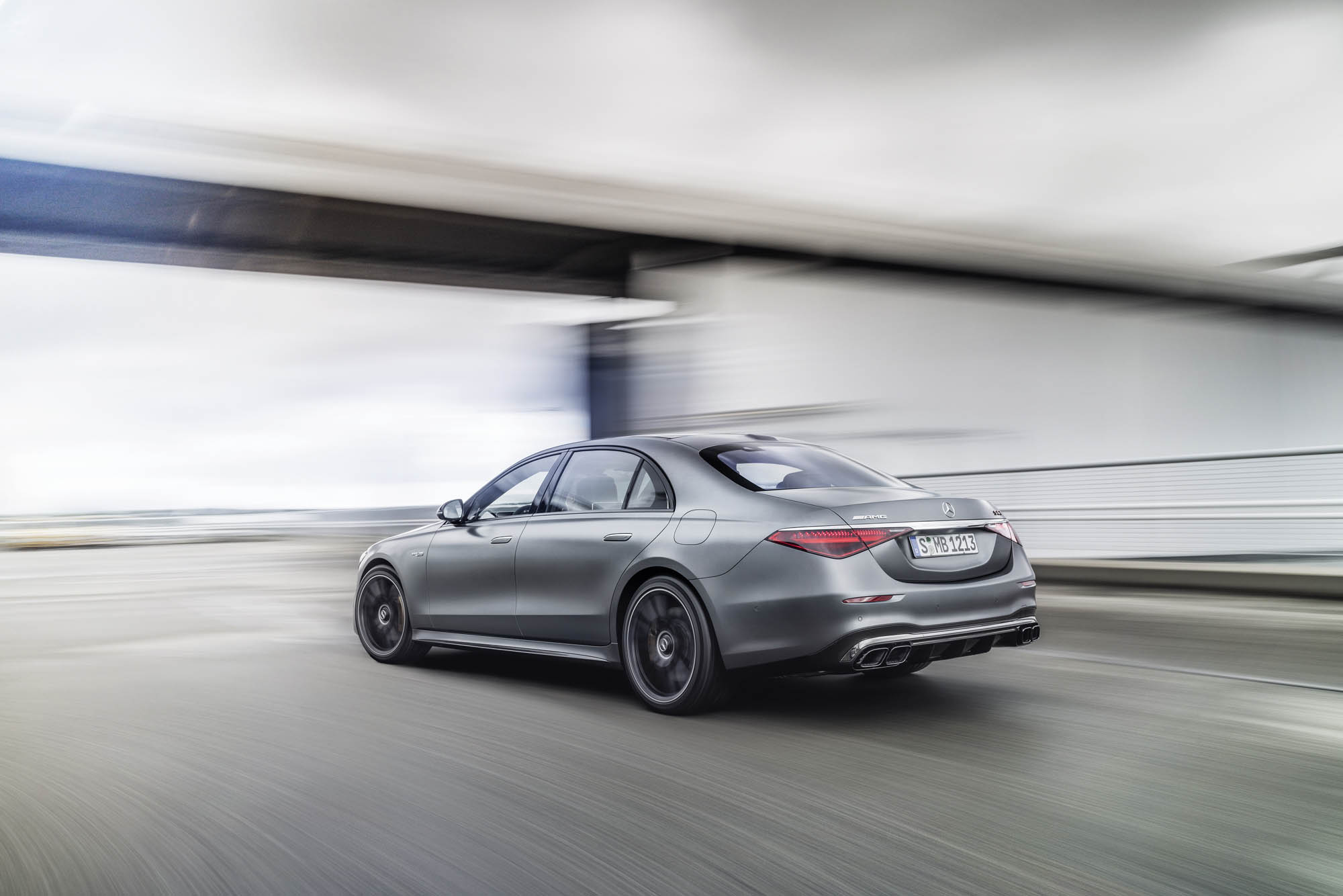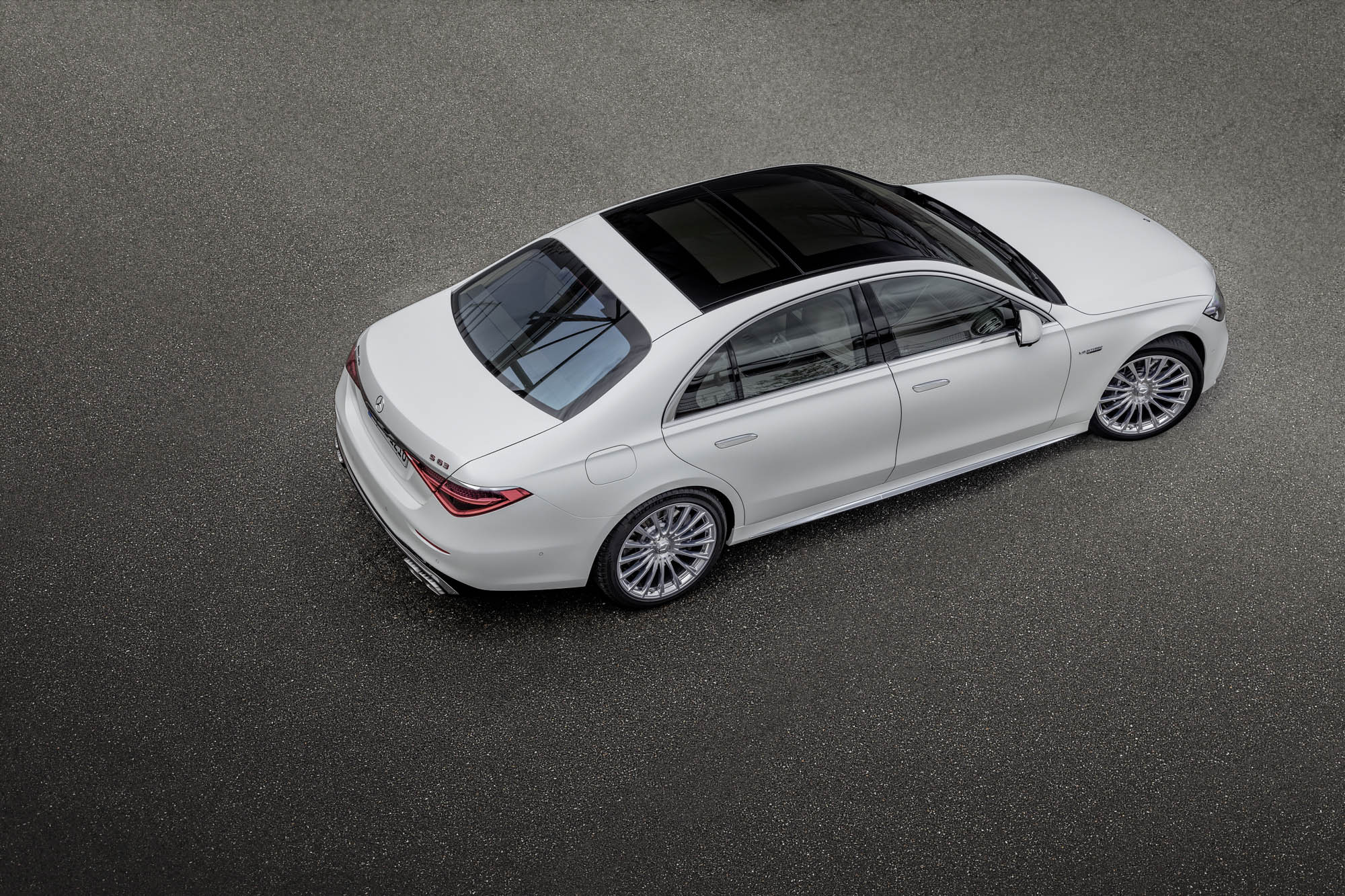 Για πρώτη φορά, μια S-Class Saloon φέρει την ειδική για την AMG εμπρός μάσκα με κάθετες διατρήσεις, που στο κάτω μέρος της διαθέτει μεγάλες πλευρικές εισαγωγές αέρα. Στα πλαϊνά, ξεχωρίζουν οι σφυρήλατες ζάντες AMG -έως 21 ιντσών– επάνω στις οποίες είναι τοποθετημένα ελαστικά Michelin Pilot Sport 4 S και τα βαθύτερα μαρσπιέ που διαμορφώνουν μια πιο χαμηλή στάση. Στο πίσω μέρος, υπάρχουν χαρακτηριστικά σχεδιαστικά στοιχεία των μοντέλων 63, όπως τα δύο ζεύγη τραπεζοειδών απολήξεων εξατμίσεων και ο διαχύτης με διαμήκη πτερύγια.