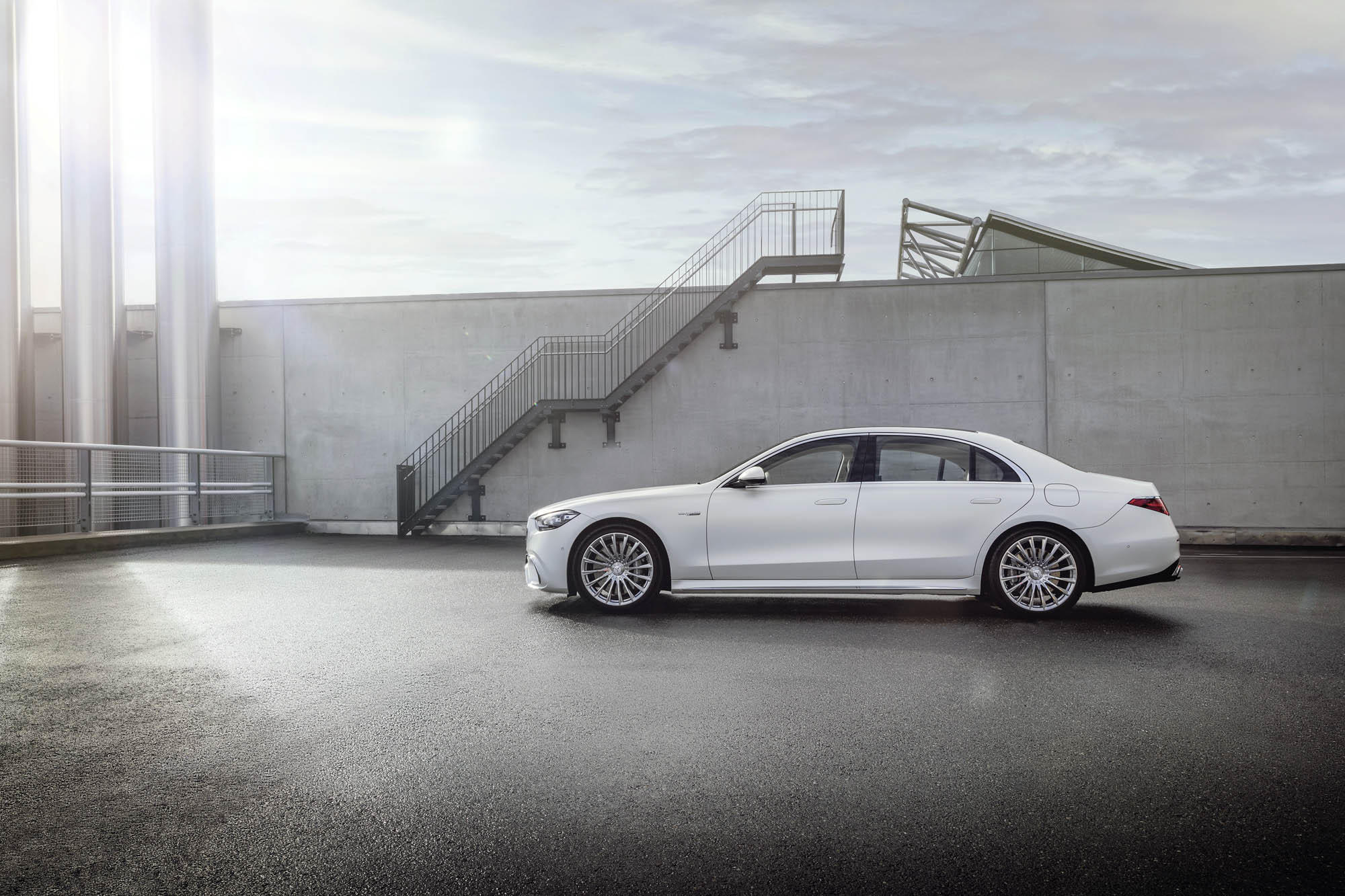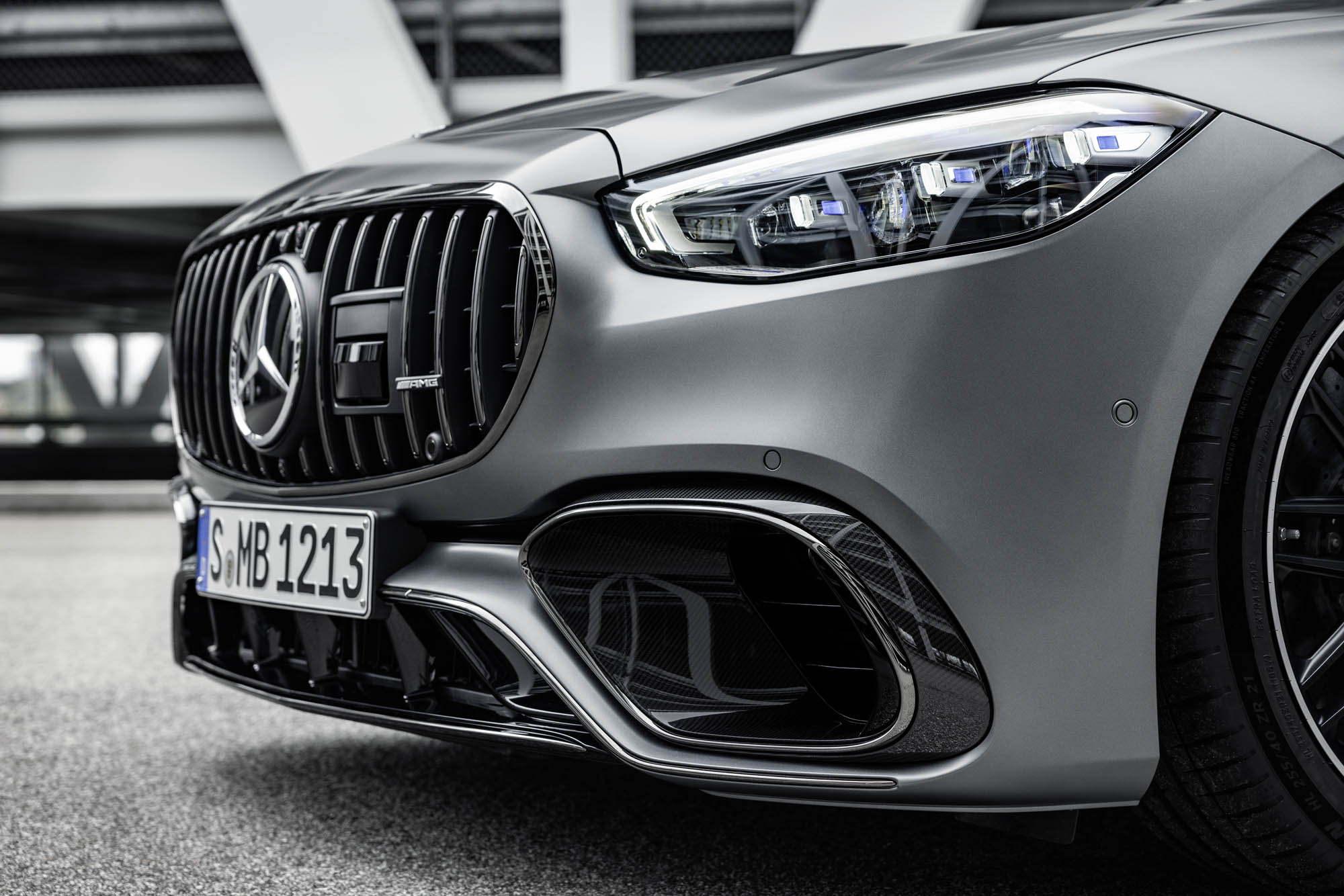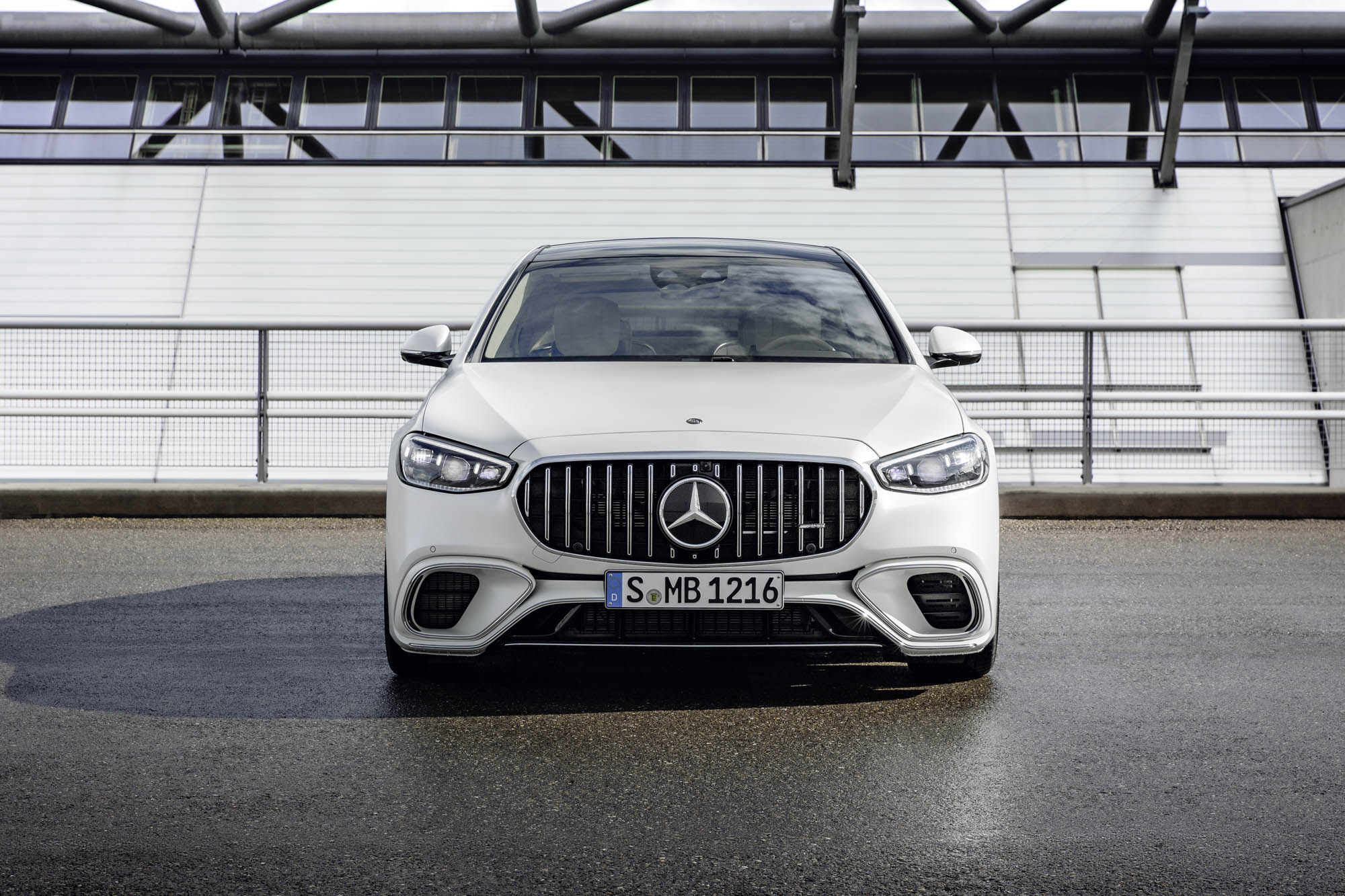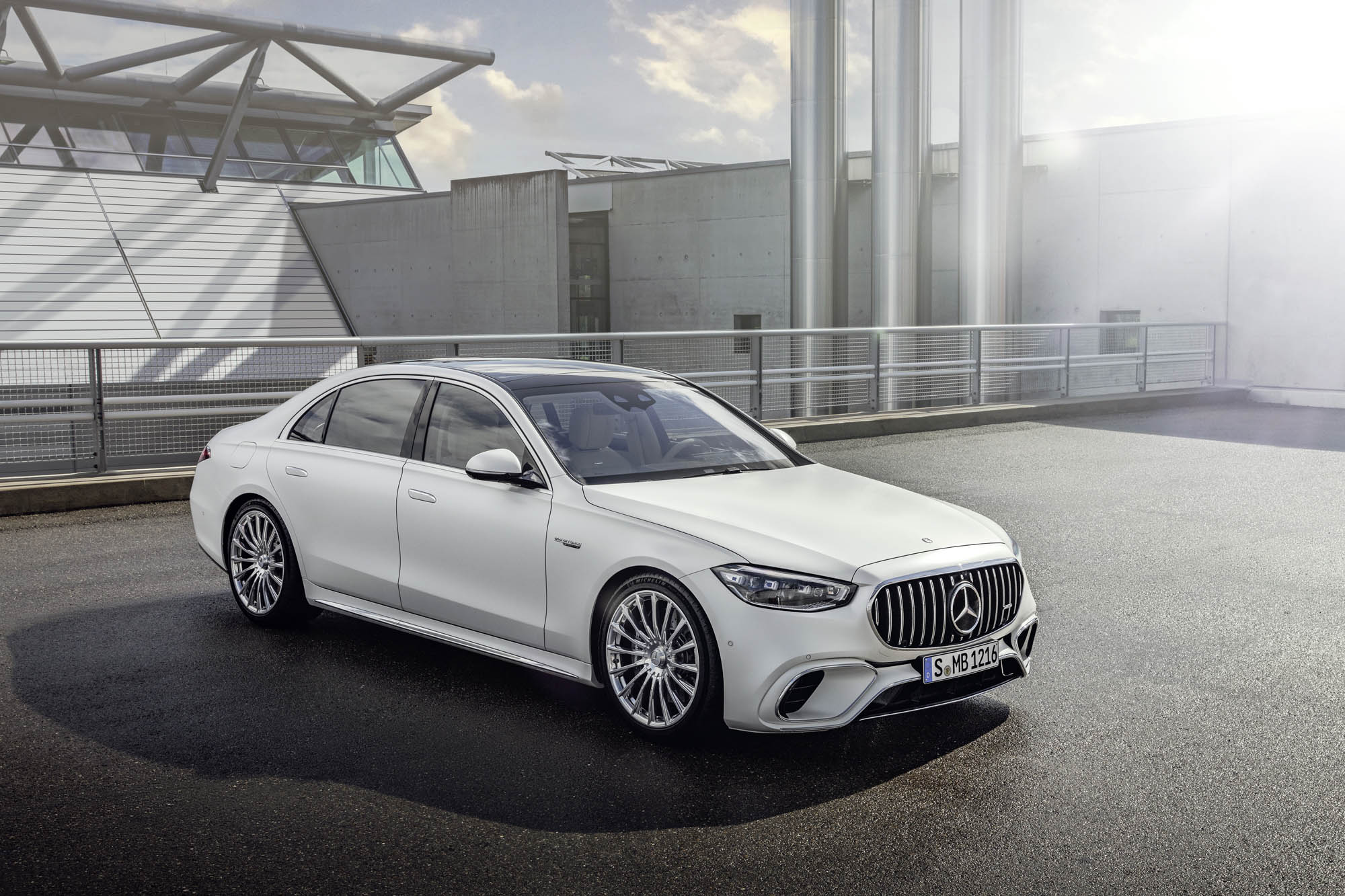 Για πρώτη φορά, μια S-Class Saloon φέρει την ειδική για την AMG εμπρός μάσκα με κάθετες διατρήσεις, που στο κάτω μέρος της διαθέτει μεγάλες πλευρικές εισαγωγές αέρα. Στα πλαϊνά, ξεχωρίζουν οι σφυρήλατες ζάντες AMG -έως 21 ιντσών– επάνω στις οποίες είναι τοποθετημένα ελαστικά Michelin Pilot Sport 4 S και τα βαθύτερα μαρσπιέ που διαμορφώνουν μια πιο χαμηλή στάση. Στο πίσω μέρος, υπάρχουν χαρακτηριστικά σχεδιαστικά στοιχεία των μοντέλων 63, όπως τα δύο ζεύγη τραπεζοειδών απολήξεων εξατμίσεων και ο διαχύτης με διαμήκη πτερύγια.