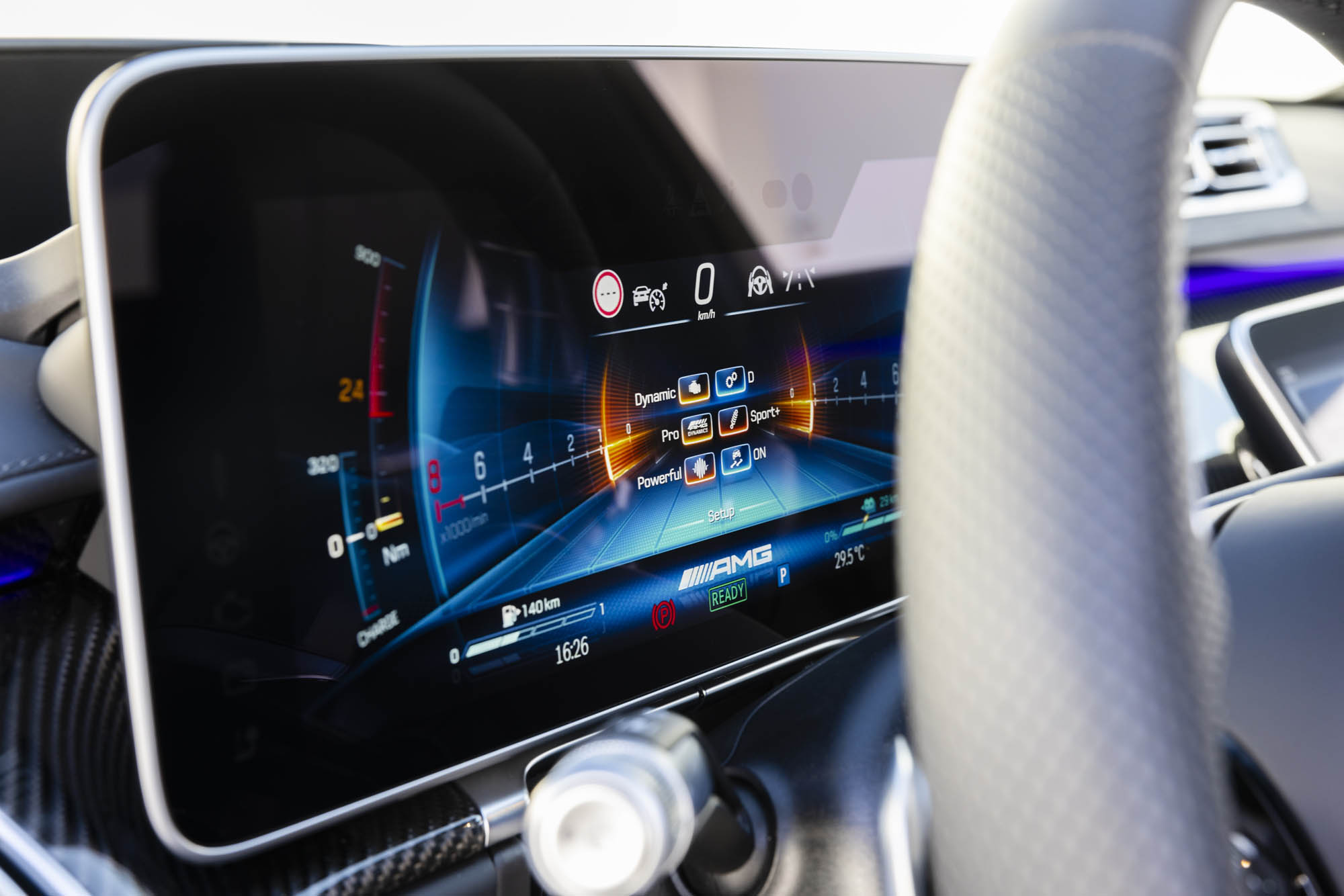 Υπάρχουν ελάχιστα χειριστήρια στο εσωτερικό, ενώ τα καθήκοντα infotainment αναλαμβάνει μια οθόνη αφής 12,3 ιντσών στο κέντρο του ταμπλό. Αυτή συνδυάζεται με έναν πλήρως ψηφιακό πίνακα οργάνων και χρησιμοποιεί το λογισμικό MBUX της Mercedes, με βελτιώσεις ειδικά για την AMG. Αυτές περιλαμβάνουν ένα εντυπωσιακό θέμα Supersport και οθόνες επιδόσεων, οι οποίες παραθέτουν τις θερμοκρασίες του συστήματος κίνησης και τις λειτουργίες οδήγησης. Τα δεδομένα τηλεμετρίας είναι επίσης διαθέσιμα μέσω του μενού AMG Track Pace.