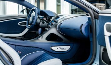 Έτσι το αμάξωμα βάφεται στην ποιητική απόχρωση Argent Atlantique συνδυασμένη με λεπτομέρειες Bleu Royal Carbon που μεταφράζονται σε γενναιόδωρα σε μέγεθος, τμήματα από γυμνό ανθρακόνημα. Το στοιχείο που κάνει τη διαφορά στο εσωτερικό είναι η επιλογή της γαλλικής φίρμας να επενδύσει το ταμπλό, τα εσωτερικά των θυρών και τις λεπτομέρειες από δέρμα σε ένα μοτίβο που θυμίζει ουσιαστικά ύφανση και για την παραγωγή του οποίου απαιτήθηκαν 2,5 χλμ. (!) λωρίδων δέρματος.