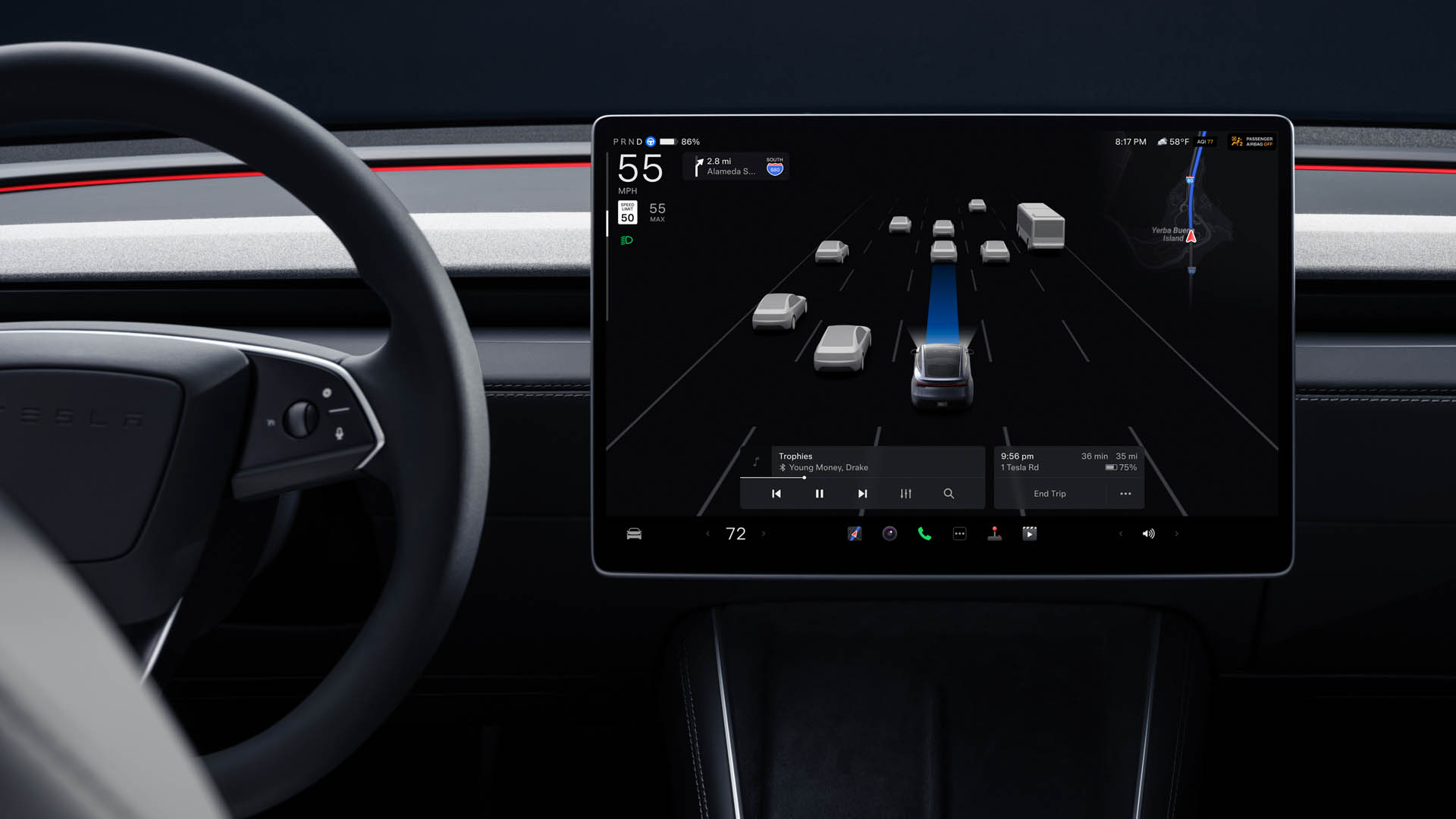 Το infotainment στο νέο Model Y είναι το πιο πρόσφατο της Tesla – αν και βρίσκεται στην ίδια οθόνη αφής 15,4 ιντσών. Στα πίσω καθίσματα υπάρχει και μια νέα οθόνη αφής 8 ιντσών η οποία ελέγχει το κλιματιστικό αλλά επιτρέπει στους πίσω επιβάτες να παίζουν… παιχνίδια σε αυτήν.