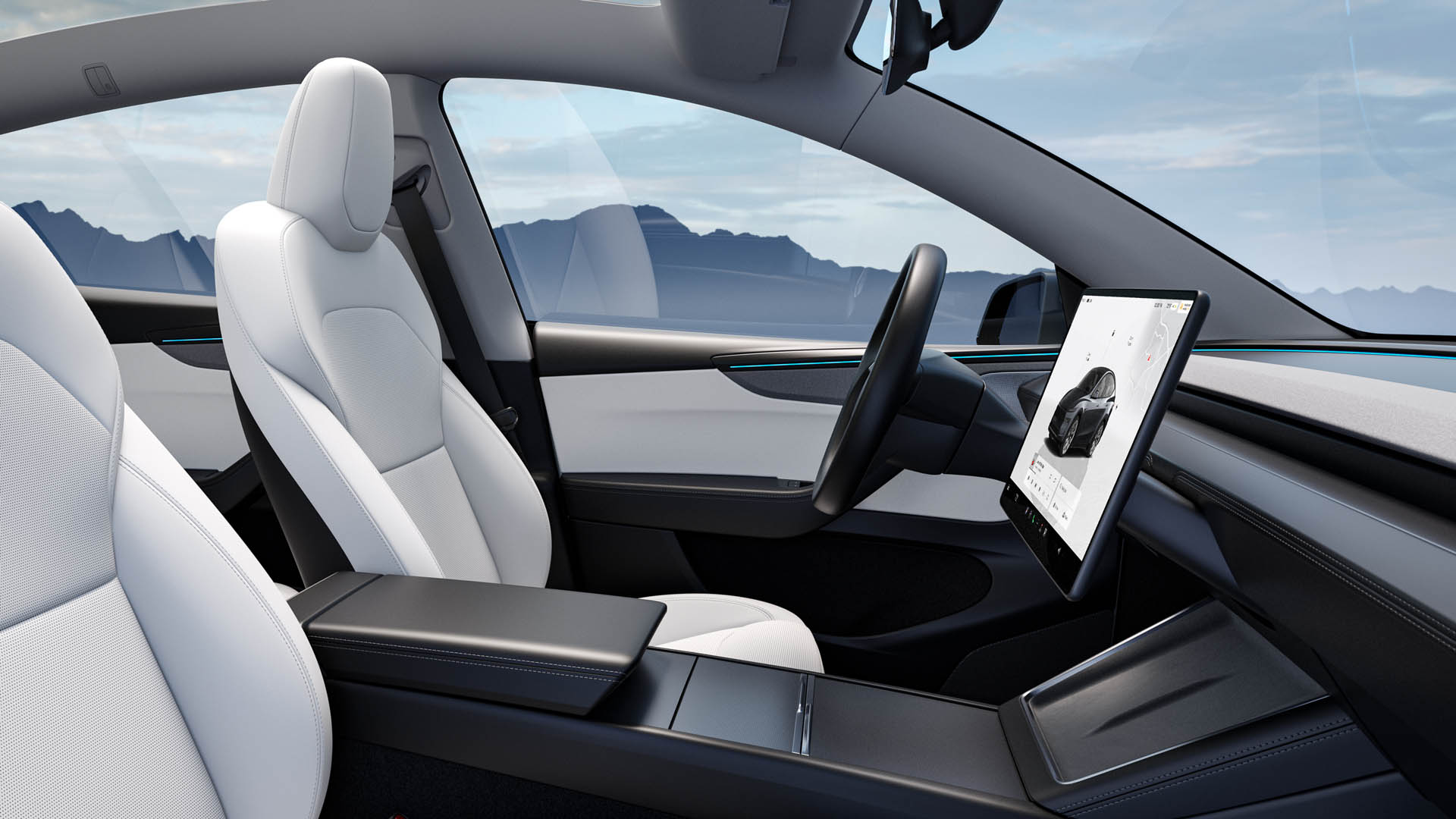 Η υπόλοιπη καμπίνα είναι διαθέσιμη σε μαύρο ή λευκό χρώμα και διαθέτει νέα κεντρική κονσόλα με ελαφρώς διαφορετική επένδυση, επανασχεδιασμένο κάλυμμα πάνω από τις ποτηροθήκες, νέο τιμόνι – σαν αυτό που είδαμε και στο Model 3 – και ανασχεδιασμένα πάνελ θυρών, με περιμετρικό ατμοσφαιρικό φωτισμό. Και τα τέσσερα καθίσματα είναι θερμαινόμενα και αεριζόμενα, ενώ υπάρχουν δύο θύρες USB 65W μπροστά που μπορούν να φορτίσουν δύο φορητούς υπολογιστές ταυτόχρονα.