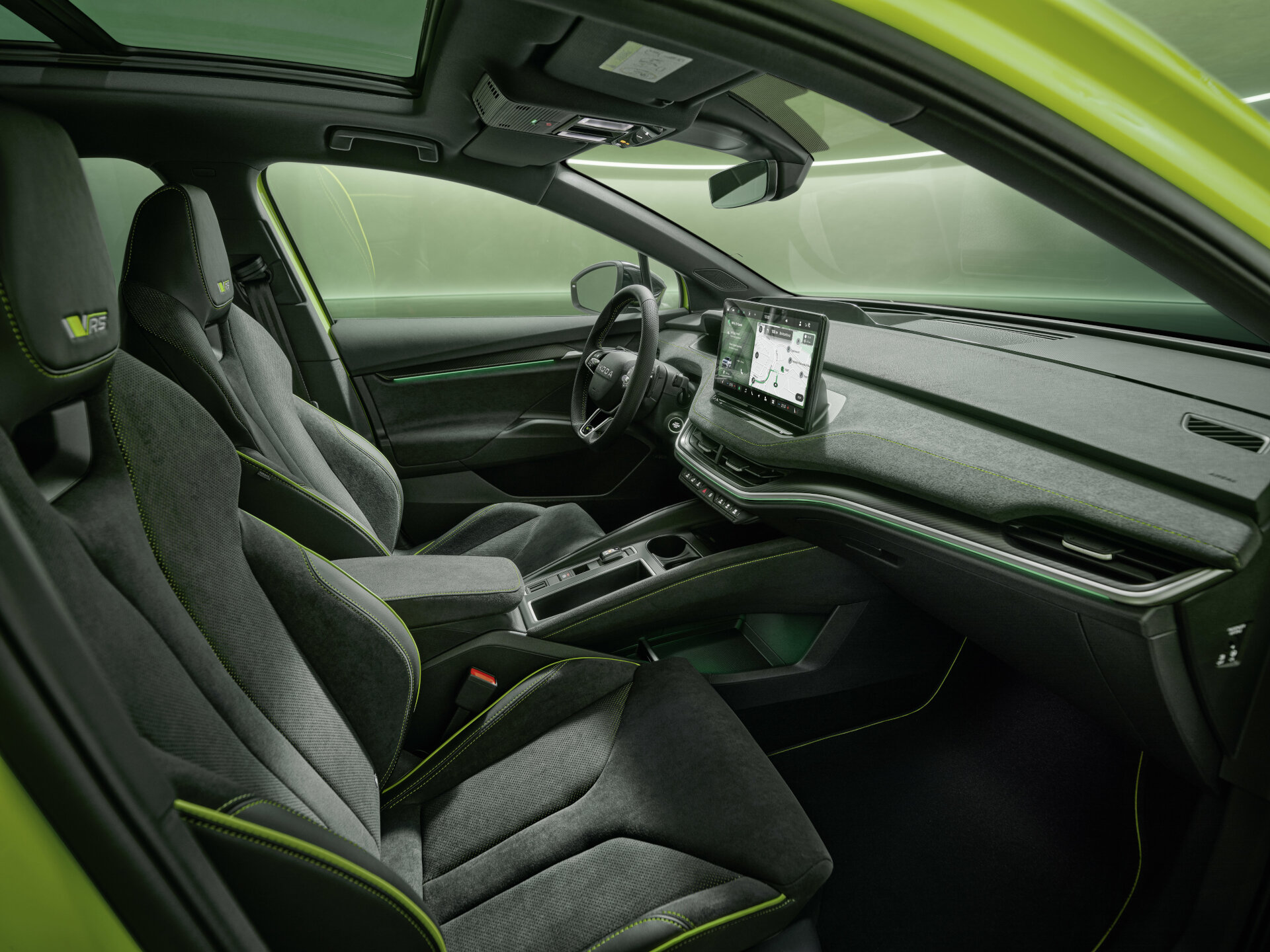 Εμφανισιακά το Enyaq RS αποκτά διακριτικά σπορ στοιχεία, με πιο αιχμηρούς και επιθετικούς προφυλακτήρες, ζάντες αλουμινίου σε διαστάσεις έως 21 ίντσες και νέα χρώματα, όπως το Hyper Green που εμφανίζεται στις φωτογραφίες. Τόσο οι SUV όσο και οι Coupe εκδόσεις αποκτούν προβολείς LED Μatrix, που πλαισιώνουν τη γρίλια Tech Deck. Γύρω από τα παράθυρα αλλά και στις ράγες οροφής, στα σήματα και στα καλύμματα των καθρεφτών υπάρχουν μαύρα στοιχεία, ενώ τα επανασχεδιασμένα πίσω φώτα LED ολοκληρώνουν την εμφάνιση, η οποία θυμίζει αρκετά την RS έκδοση του Elroq.