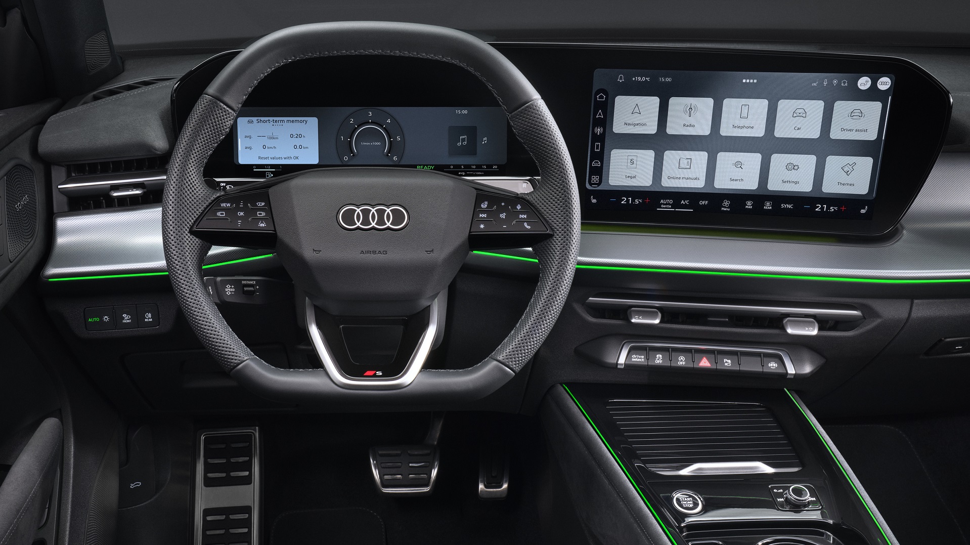 Γνώριμη από τα μεγαλύτερα μοντέλα της μάρκα είναι η εικόνα στο εσωτερικό. Ο ψηφιακός πίνακας οργάνων 11,9” και η κυρτή κεντρική οθόνη αφής MMI 12,8” αποτελούν μια συνέχεια και δημιουργούν μια high-tech αύρα. Ο επιλογέας κίνησης έχει μεταφερθεί στην κολώνα του τιμονιού, απελευθερώνοντας χώρο για θήκες στην κονσόλα.
