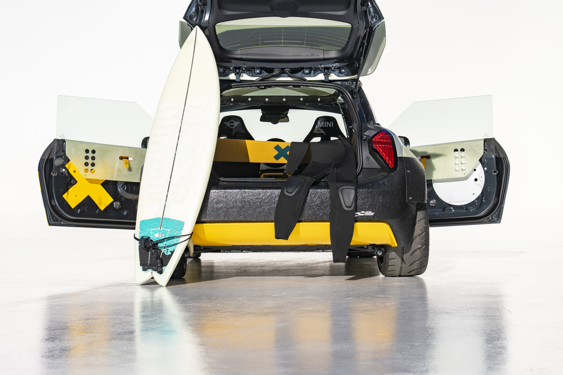 Το πρώτο πρωτότυπο ονομάζεται «The Skeg» και βασίζεται στο νέο MINI JCW Electric των 258 ίππων. Εμπνέεται από τον κόσμο του σερφ για τα μοναδικά σχεδιαστικά στοιχεία και υλικά του, υιοθετώντας ημιδιαφανή πάνελ κατασκευασμένα από fiberglass, που συμβάλλουν στη μείωση του βάρους του concept κατά 15% σε σχέση με το κανονικό αυτοκίνητο. Οι προεκτάσεις στα φτερά, το κίτρινο livery, οι πιο μεγάλοι τροχοί, η μεγάλη αεροτομή και η φωτιζόμενη μάσκα καταφέρνουν να τραβήξουν όλα τα βλέμματα.