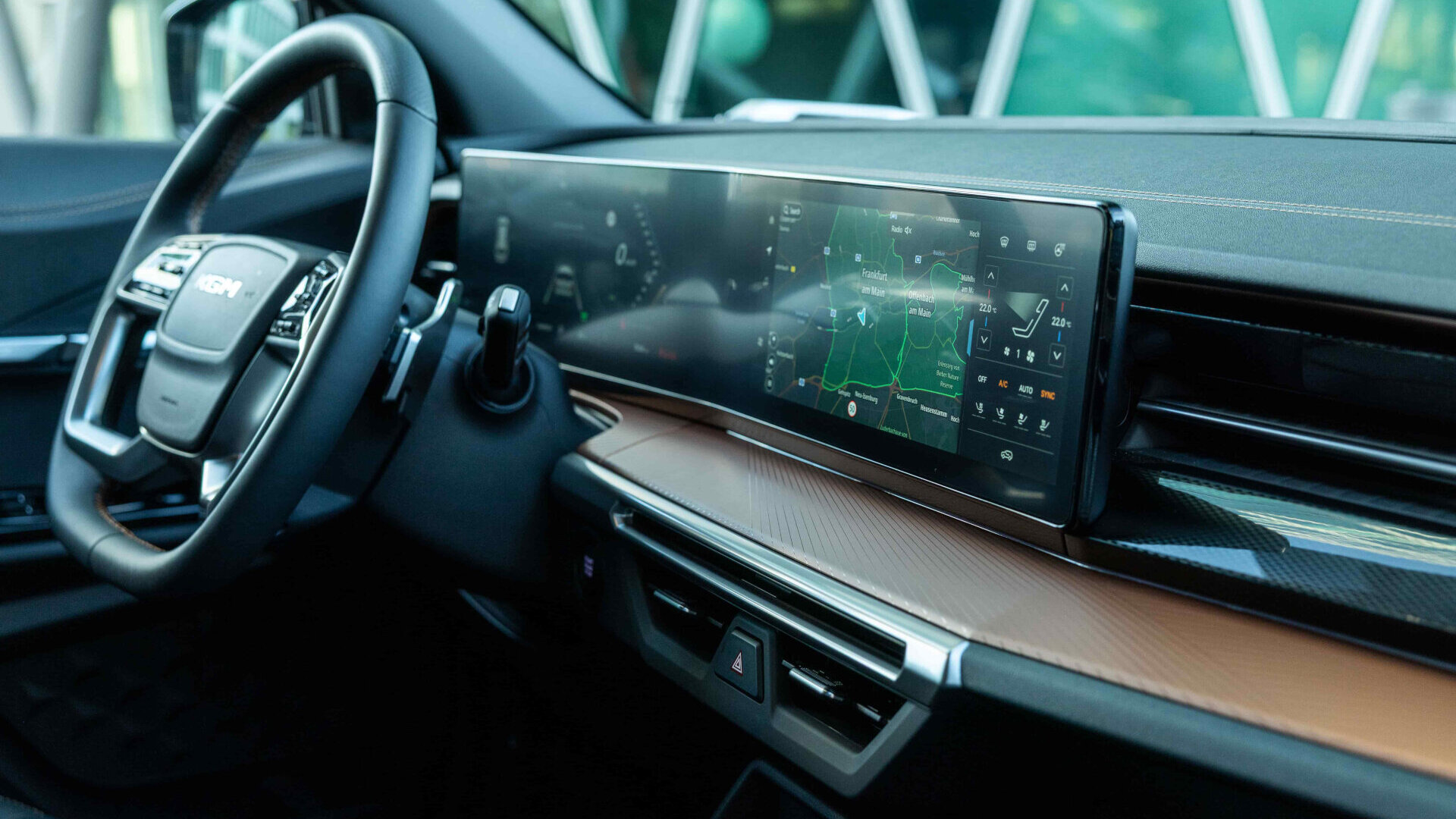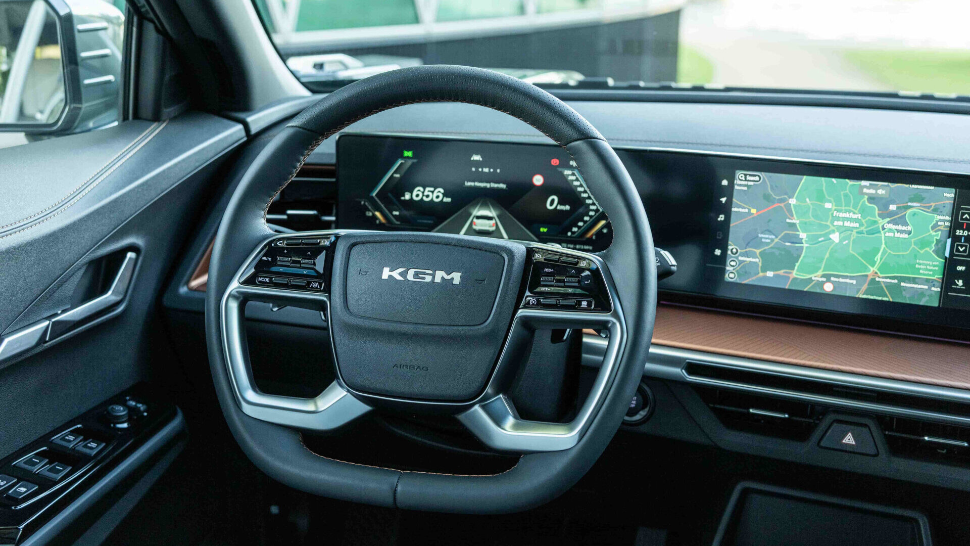 Περνώντας στην καμπίνα, το Musso EV υιοθετεί τη φιλοσοφία Slim & Wide, η οποία σύμφωνα με την KGM συνδυάζει “εργονομικό σχεδιασμό με καθαρές γραμμές και ευρύχωρη διάταξη που εστιάζει στην εμπειρία οδήγησης”. Η πανοραμική οθόνη ενσωματώνει ψηφιακό πίνακα οργάνων 12,3 ιντσών με μια οθόνη αφής 12,3 ιντσών.