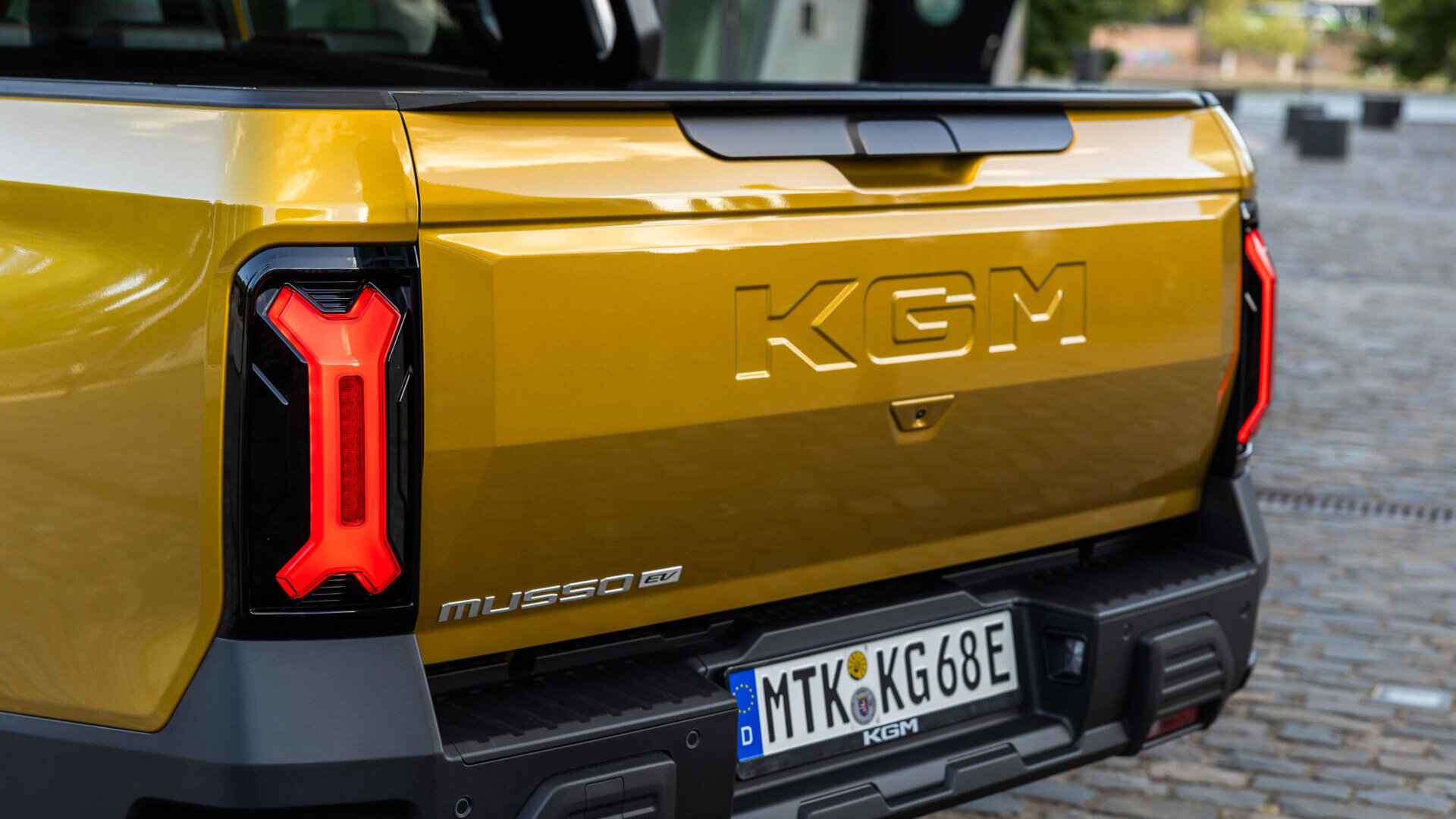 Το προφίλ του Musso EV έχει έντονες γραμμές και τονισμένους θόλους τροχών, που προσδίδουν δυναμικότητα στον σχεδιασμό. Στο πίσω μέρος το έμβλημα της KGM, όπως και τα πίσω φωτιστικά σώματα έχουν ισχυρό design, ενώ η καρότσα έχει καλύμματα για μεγαλύτερη ανθεκτικότητα.