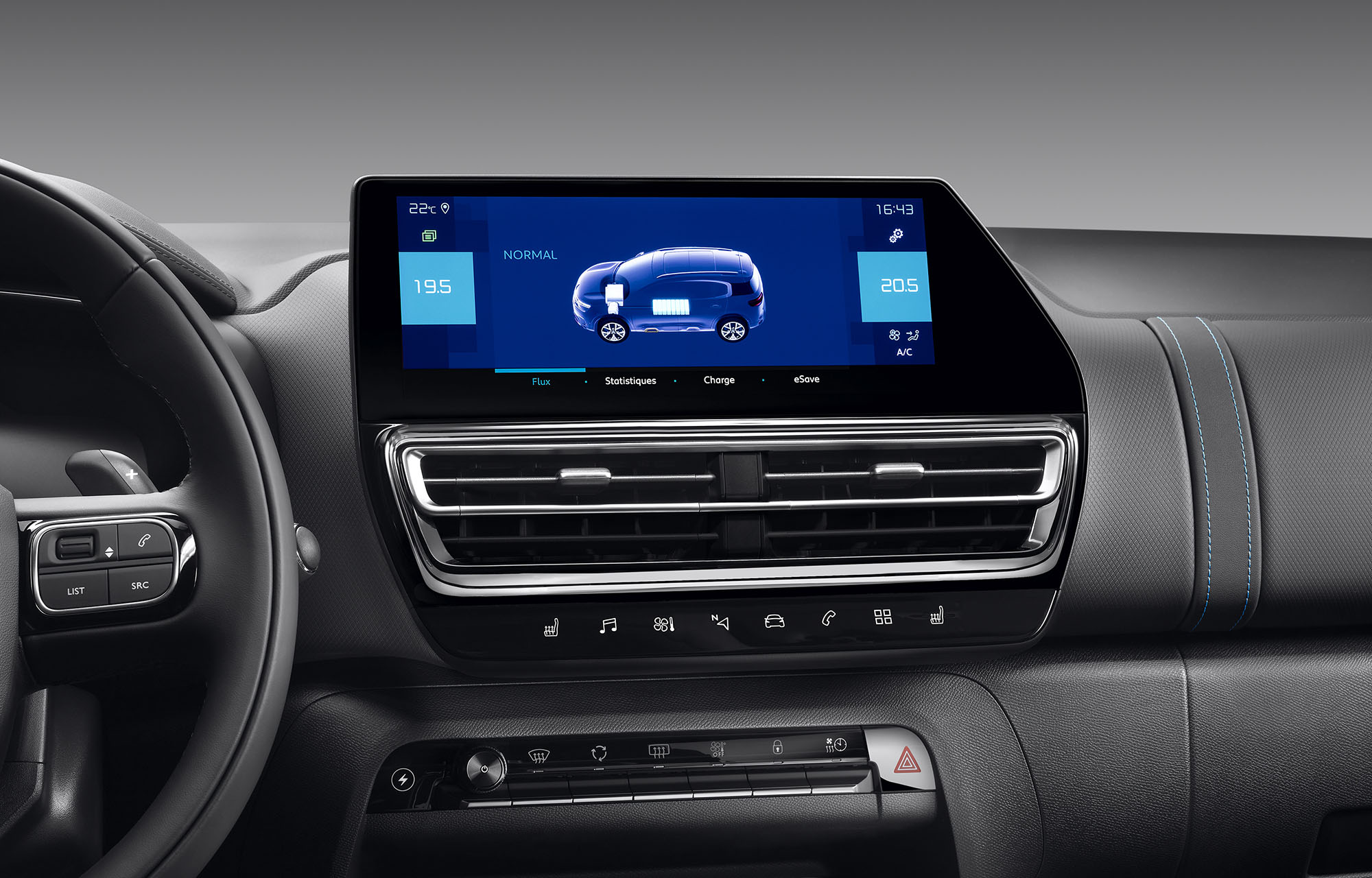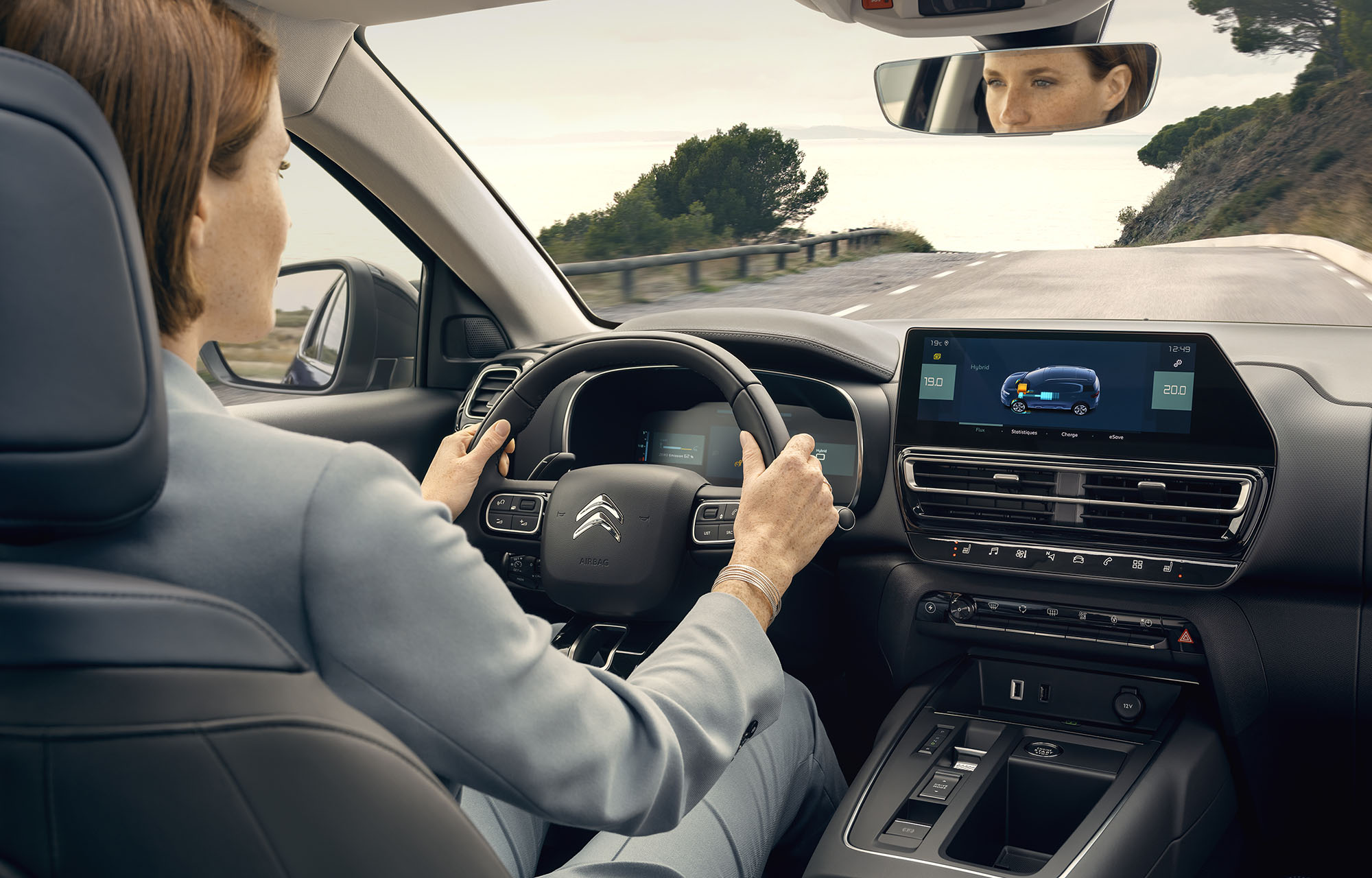 Στο εσωτερικό, η σημαντικότερη αλλαγή αφορά τη νέα οθόνης αφής 10” για το σύστημα πολυμέσων, η οποία εξέχει από το ταμπλό και επιτρέπει στον οδηγό να μην χαμηλώνει το βλέμμα του. Ενσωματώνει χάρτες πλοήγησης στις εκδόσεις βενζίνης και diesel του C5 Aircross, όπως και από το επίπεδο εξοπλισμού Feel του υβριδικού μοντέλου. Στην κεντρική κονσόλα είναι πιο εργονομική πλέον η διάταξη των χειριστηρίων, με το νέο e-Toggle επιλογέα να ενσωματώνει τη λειτουργία του συστήματος ελέγχου πρόσφυσης Grip Control και, στις plug-in-υβριδικές εκδόσεις, τις τρεις επιπλέον επιλογές (Electric, Hybrid ή Sport).