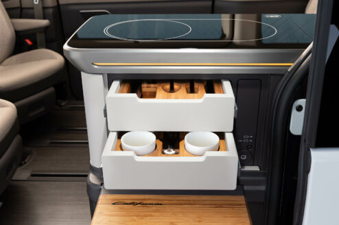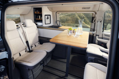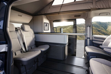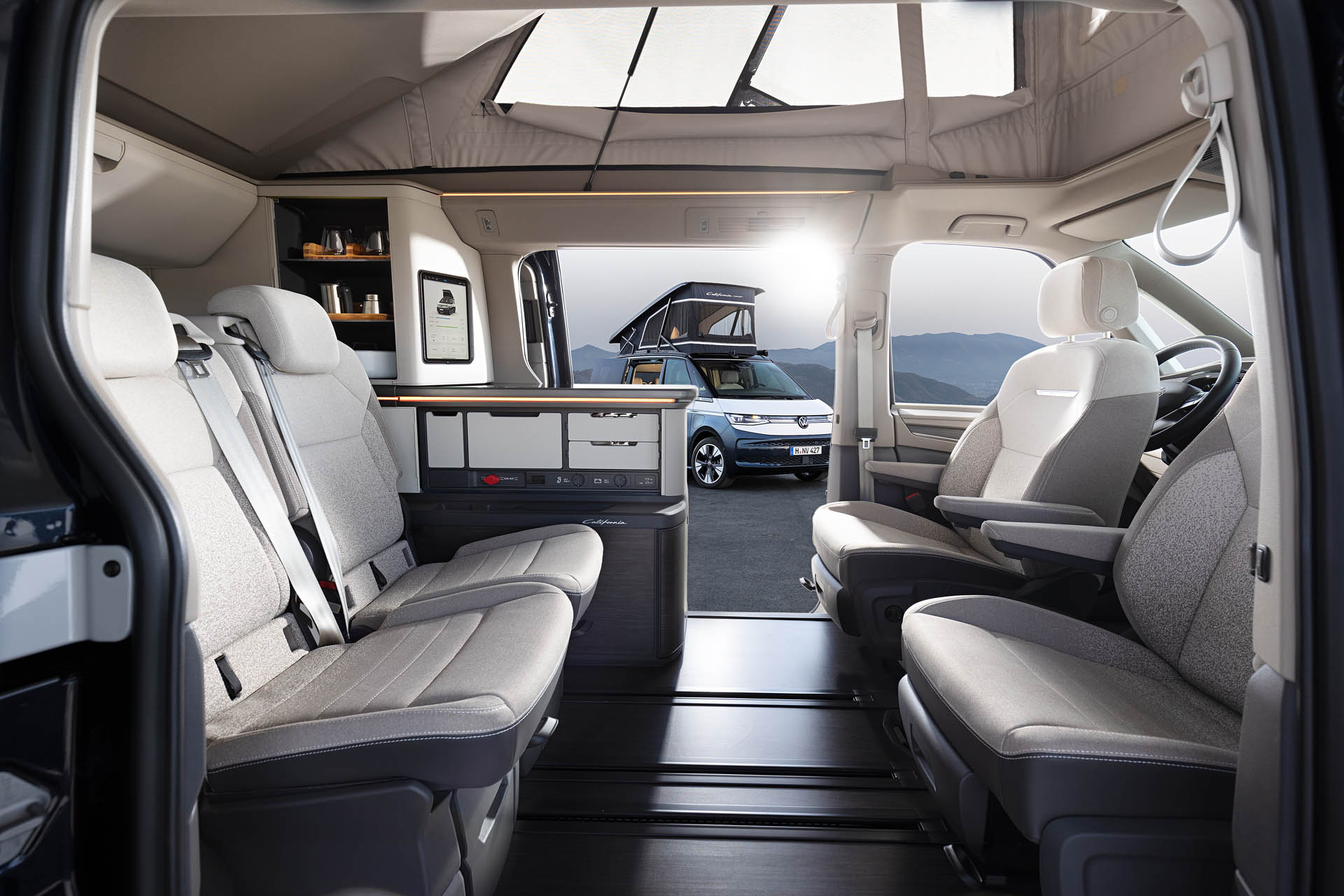 Στο εσωτερικό, υπάρχει μια κουζίνα με επαγωγικές εστίες, ψυγείο και πολλές έξυπνες λύσεις αποθήκευσης. Όπως και στο υπάρχον California, τα εμπρός καθίσματα περιστρέφονται 180 μοίρες, ενώ τα πίσω καθίσματα μπορούν να ανασηκωθούν τελείως ή να αναδιπλωθούν για να γίνουν διπλό κρεβάτι. Τα καθίσματα είναι καλυμμένα με ένα ανθεκτικό και ευχάριστο στην αφή ύφασμα, σύμφωνα με τη Volkswagen. Ένα επιπλέον κρεβάτι βρίσκεται στην οροφή.