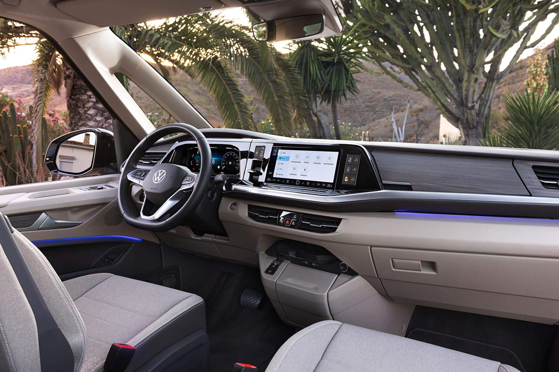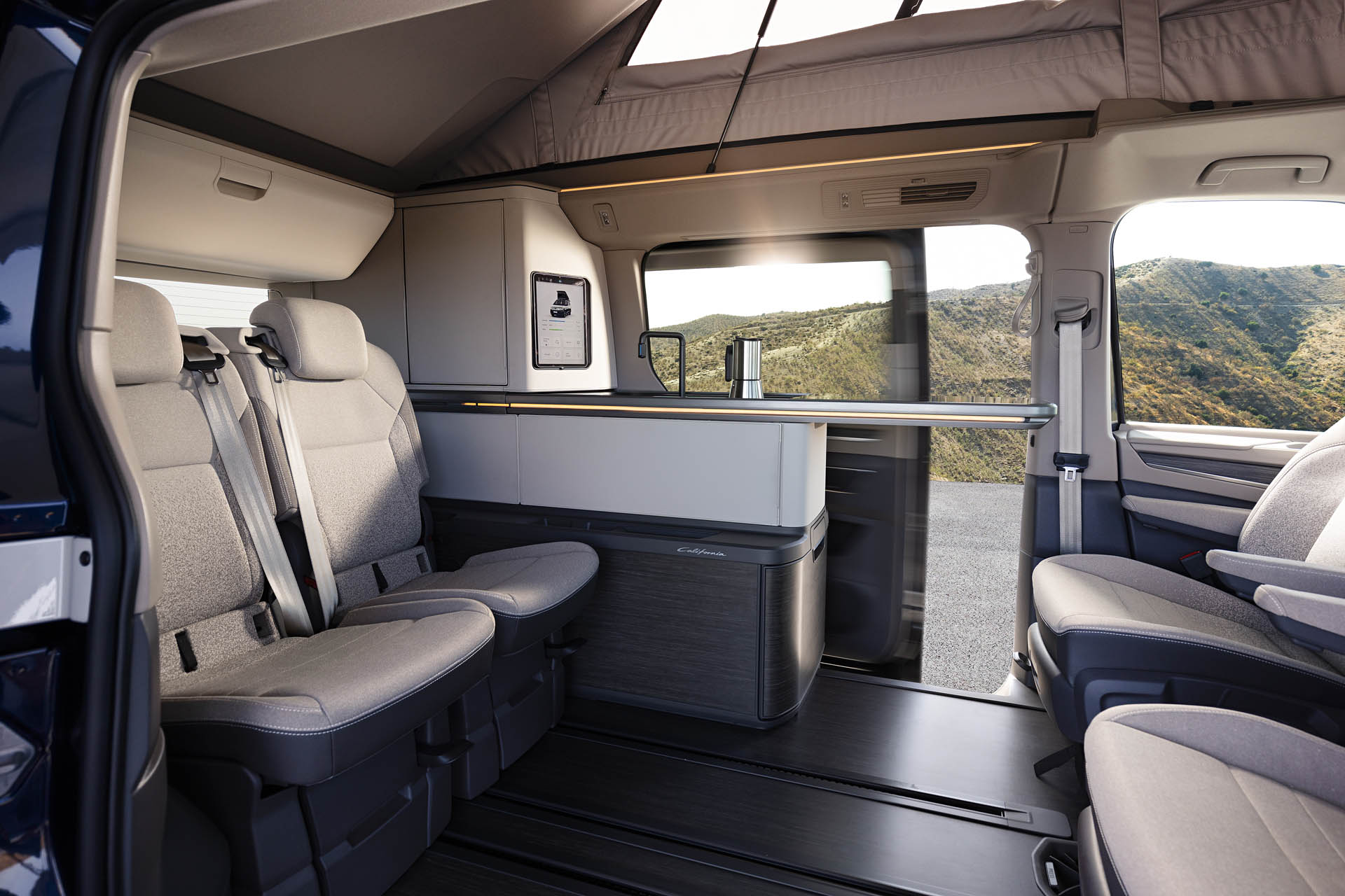 Το T7 California Concept διαθέτει ένα αναδυόμενο tablet τοποθετημένο στην τρίτη κολόνα. Αυτό ελέγχει πολυάριθμες λειτουργίες, από την αναδιπλούμενη οροφή μέχρι τον εσωτερικό φωτισμό, ενώ επιτρέπει επίσης στους ιδιοκτήτες να παρακολουθούν τα επίπεδα φρέσκου και ακάθαρτου νερού, την κατάσταση της παροχής ρεύματος καθώς και απομακρυσμένη πρόσβαση στη θερμοκρασία του ψυγείου και του βοηθητικού θερμαντήρα. Αυτή η οθόνη λειτουργεί επίσης ως μονάδα ψυχαγωγίας και μπορεί να συνδεθεί σε έναν περιστρεφόμενο βραχίονα για να μεταδίδει ταινίες και τηλεοπτικές εκπομπές μέσα στο φορτηγό.