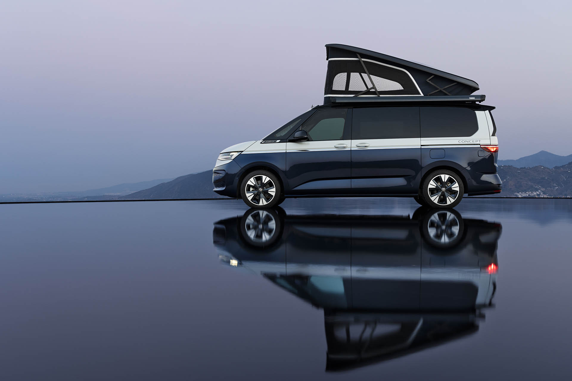 Με διχρωμία μπλε και λευκού χρώματος, οι οπτικές αλλαγές σε σχέση με το υπάρχον Multivan είναι ελάχιστες. Έχει προστεθεί μια αναδιπλούμενη οροφή, καθώς και μια τέντα στη μία πλευρά και ένα μικρότερο «ηλιακό πανί» στην άλλη. Με μεγαλύτερη μήκος και φαρδύτερο από τον προκάτοχό του T6.1, το νέο μοντέλο αποκτά επίσης συρόμενες πόρτες και στις δύο πλευρές, κάτι που σύμφωνα με τη VW επιτρέπει την εκτεταμένη χρήση του χώρου γύρω από το όχημα. Η Volkswagen το ονομάζει αυτό «Three Zone Concept».