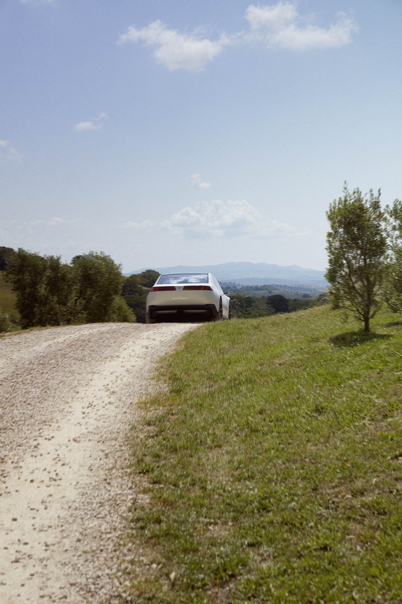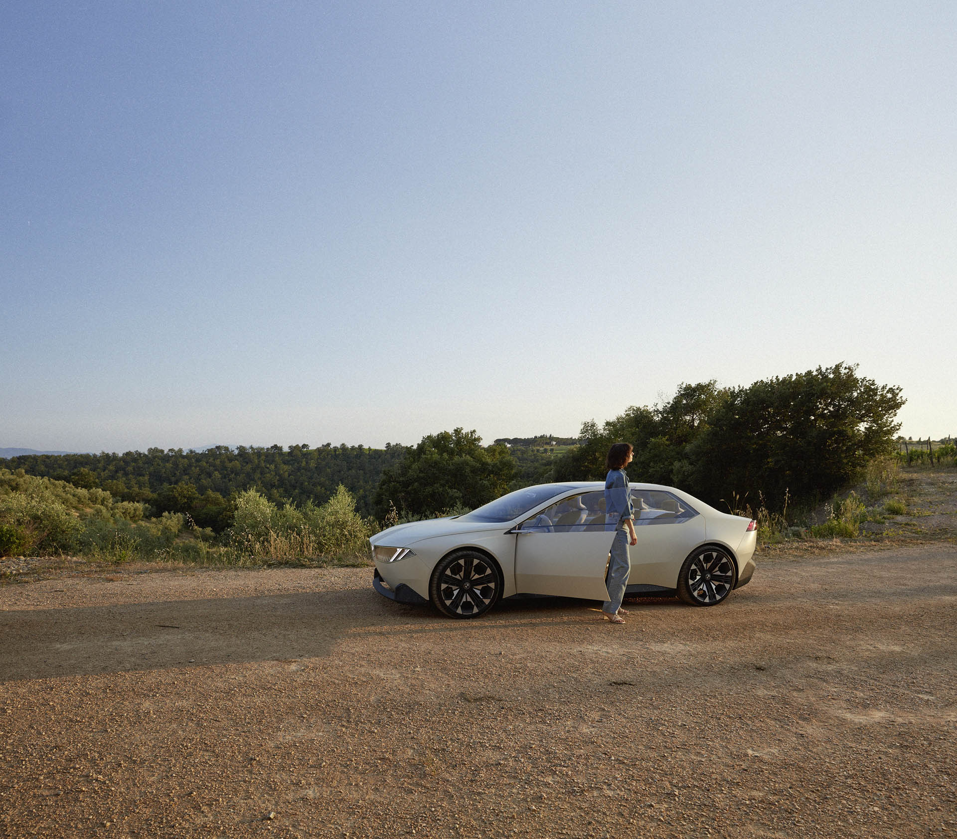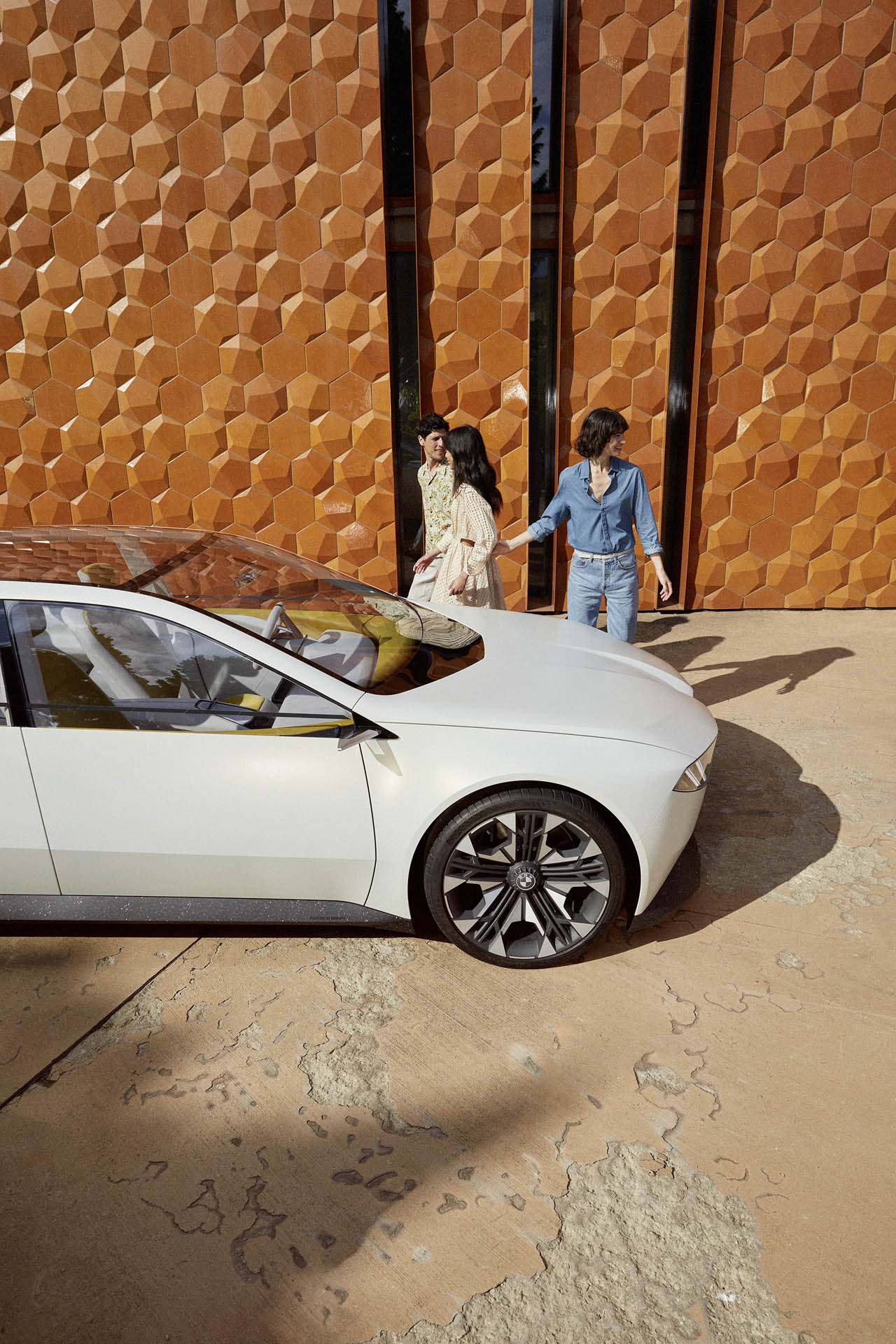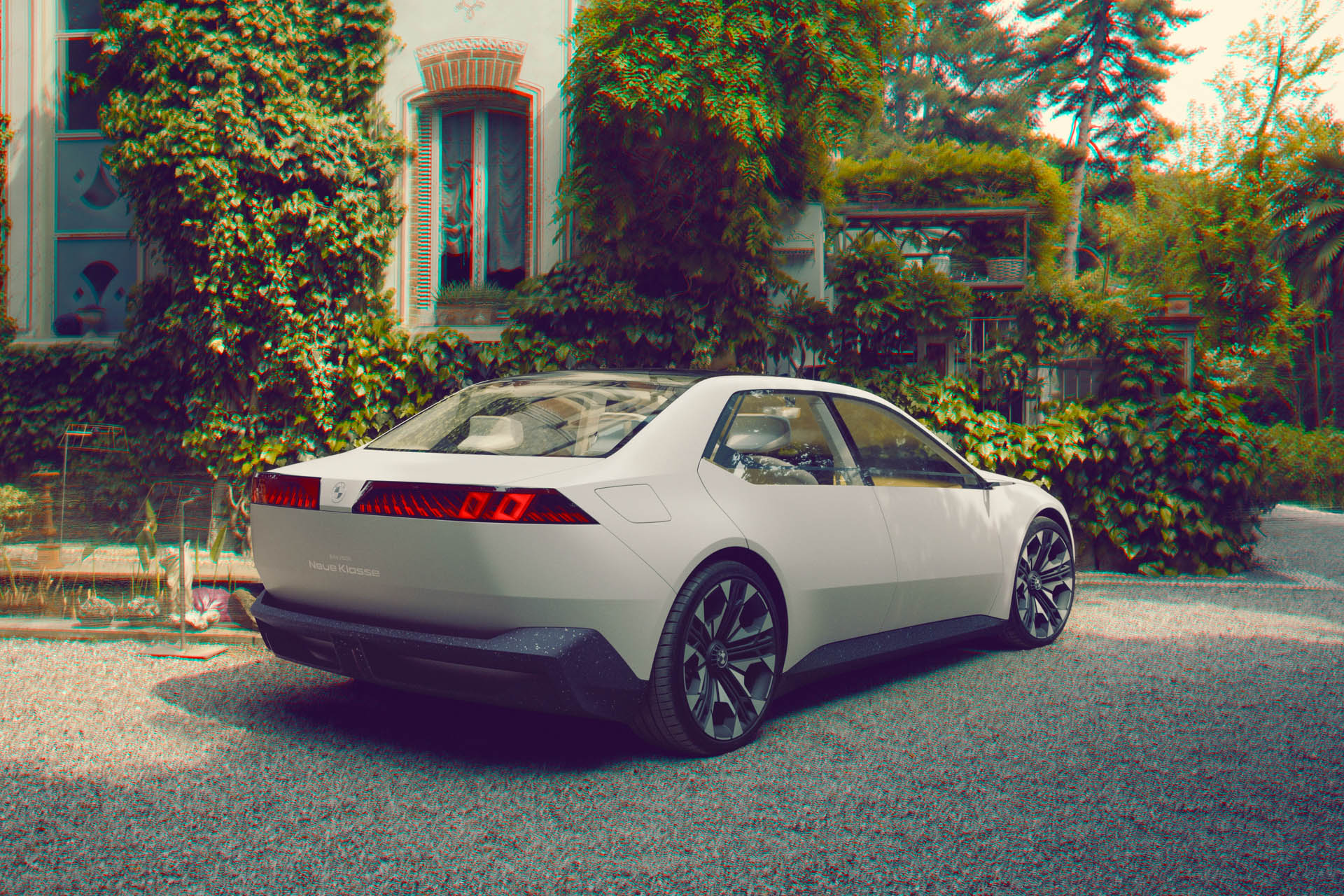 Το ρύγχος καρχαρία εξισορροπείται από ένα τετραγωνισμένο πίσω μέρος, με την κλασική σχεδίαση τριών όγκων και τις αναλογίες του sedan του Vision Neue Klasse να είναι «τόσο προοδευτικές που μοιάζει σαν να παραλείψαμε μια γενιά μοντέλων», σύμφωνα με τον επικεφαλής σχεδιασμού του ομίλου BMW, Adrian van Hooydonk. Οι αεροδυναμικές ζάντες 21 ιντσών είναι εμπνευσμένες από τον κλασικό σχεδιασμό της BMW για το μηχανοκίνητο αθλητισμό, με σταυρωτές ακτίνες.