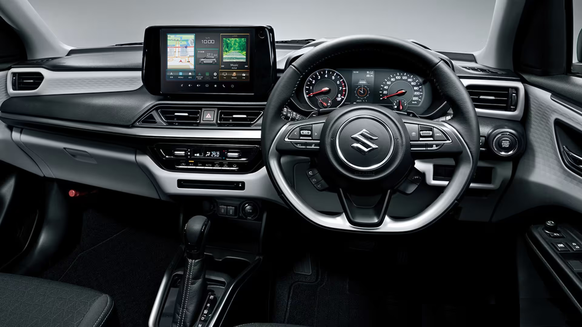 Το εσωτερικό έχει περισσότερες αναφορές στο τωρινό Swift, όπως το τιμόνι, ο λεβιές του (αυτόματου) κιβωτίου και κάποιοι διακόπτες. Ξεχωρίζει βέβαια η μεγαλύτερη οθόνη αφής 9’’ που γνωρίζουμε από το νέο S-Cross και η οποία αιωρείται πάνω από το ταμπλό. Ο δε πίνακας οργάνων φαίνεται πως θα παραμείνει με αναλογικά όργανα και μια κεντρική έγχρωμη οθόνη.