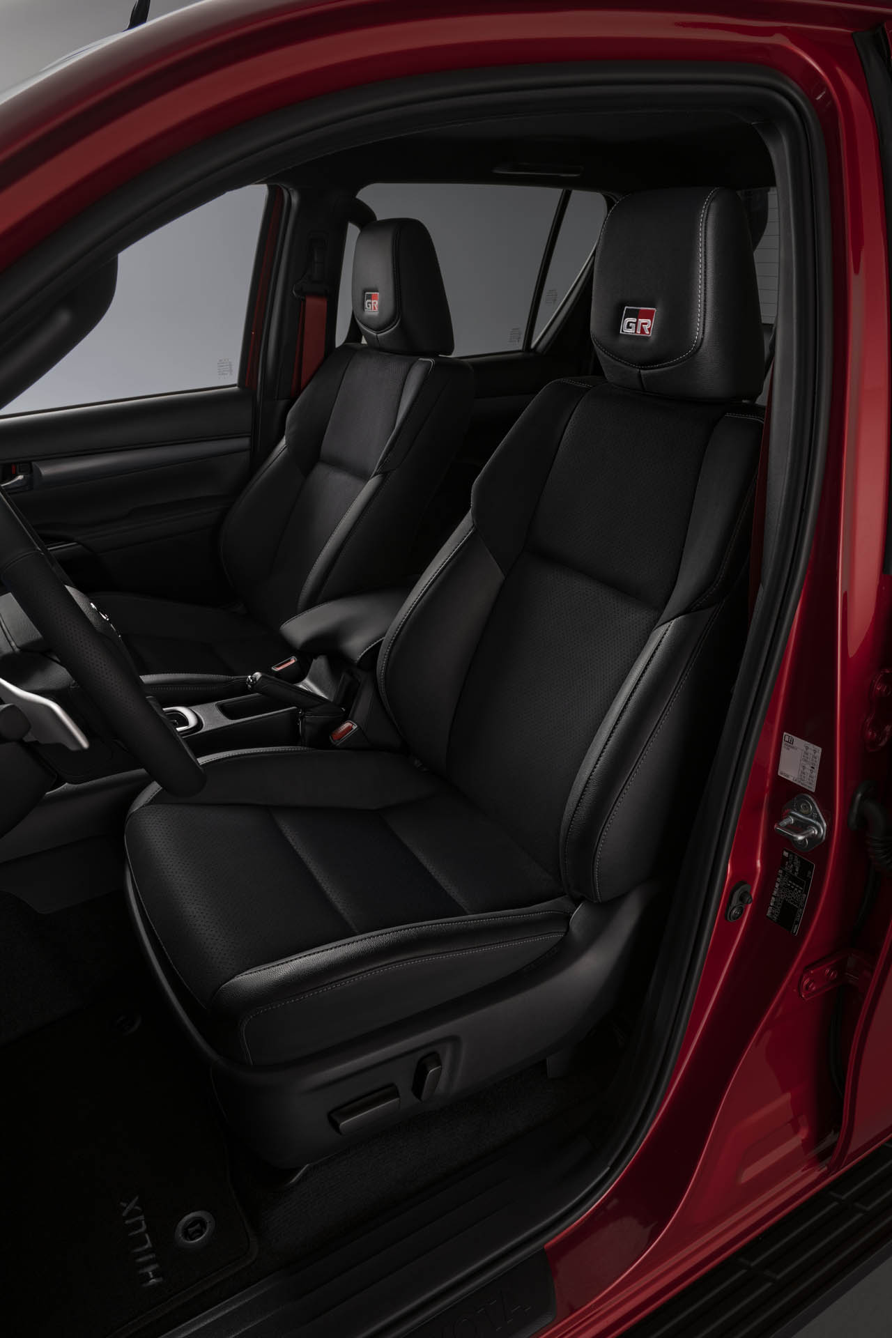 Το εσωτερικό δεν είναι τόσο πολύχρωμο όσο το απερχόμενο Hilux GR Sport. Το κόκκινο διακοσμητικό τμήμα που εκτεινόταν σε όλο το ταμπλό έχει εξαφανιστεί, και οι κόκκινες ραφές στα καθίσματα, τα υποβραχιόνια και το χειρόφρενο έχουν μετατραπεί σε ασημί. Ωστόσο, εξακολουθούν να υπάρχουν κόκκινες ζώνες ασφαλείας, καθίσματα με το σήμα GR και πεντάλ αλουμινίου.