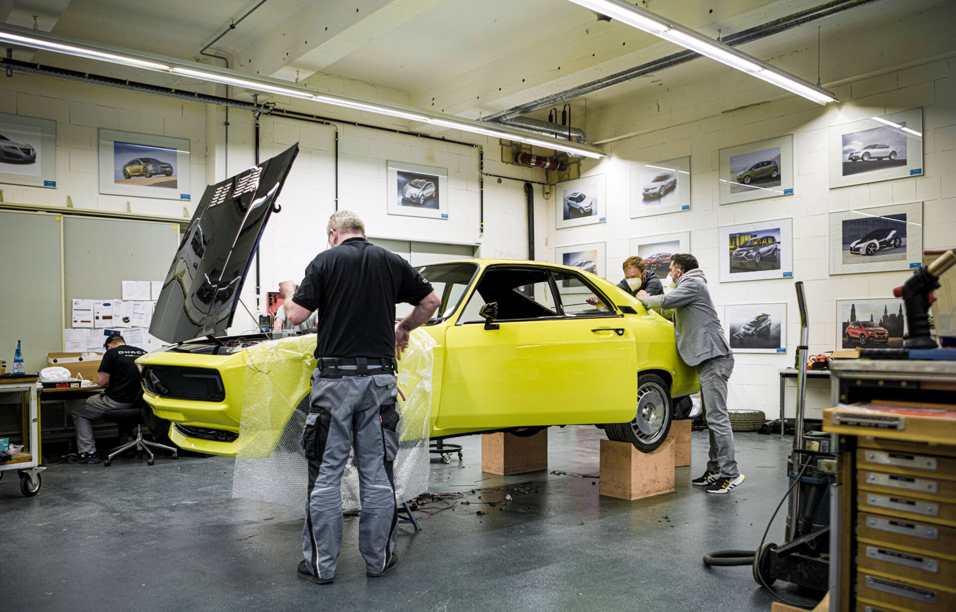 Στην αρχή υπήρχε ένα πορτοκαλί-κόκκινο Opel Manta με μαύρη οροφή από βινύλιο, της συλλογής Opel Classic. Αυθεντικό, γενικά σε καλή κατάσταση, αλλά λίγο φθαρμένο. Χωρίς «αναπαλαίωση», θύμιζε περισσότερο πλατφόρμα εξαρτημάτων. Την ίδια στιγμή, η ηλεκτρική επέλαση της Opel είναι σε πλήρη εξέλιξη με νέα μοντέλα όπως το Opel Mokka-e.