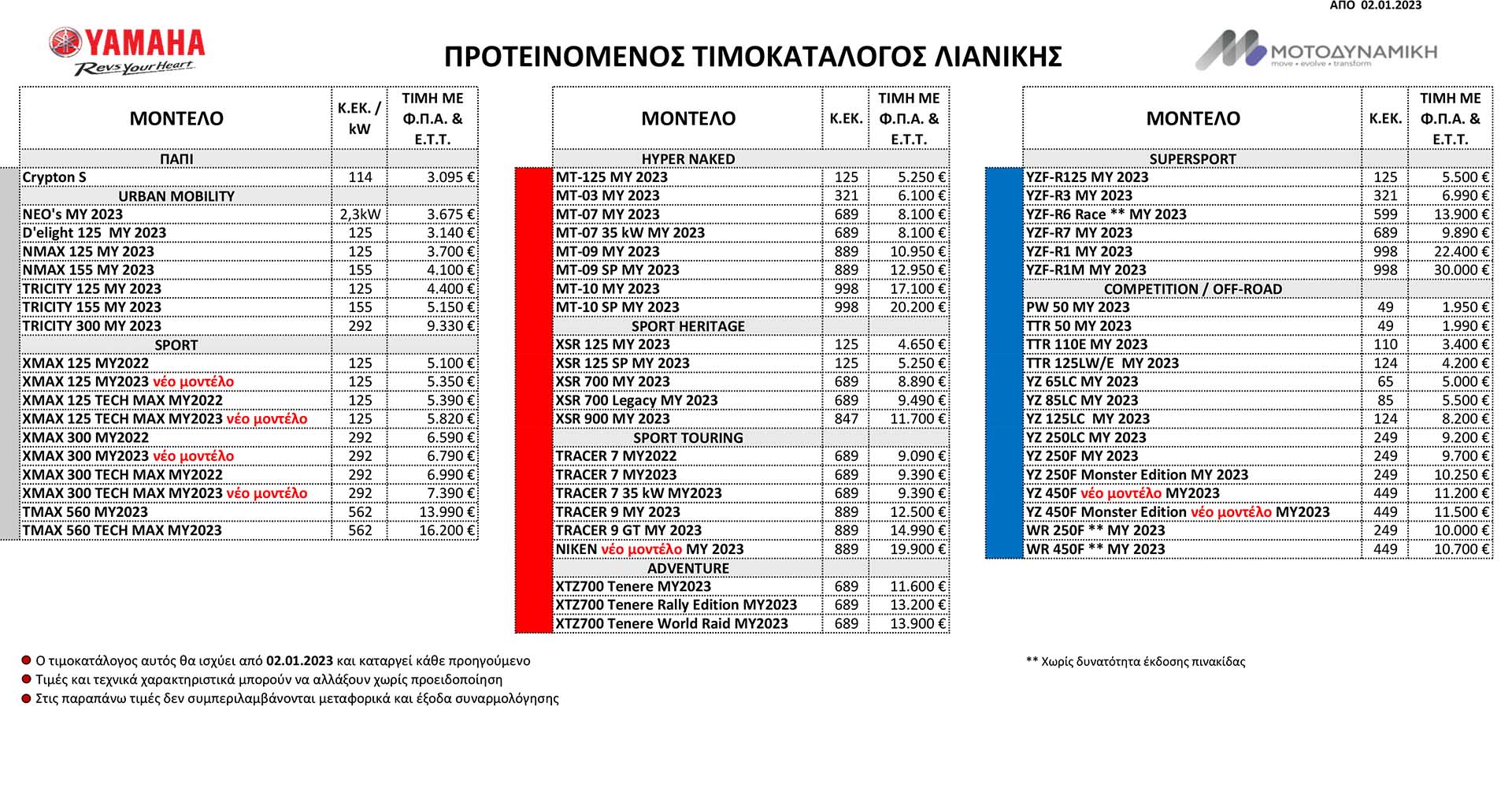 Ανακοινώθηκε ο νέος τιμοκατάλογος μοτοσυκλετών Yamaha για το 2023, που περιλαμβάνει τα επίκαιρα μοντέλα για το έτος που διανύουμε. Συγκεκριμένα τα νέα ΧΜΑΧ 125 και XMAX 125 TECH MAX καθώς και τα αντίστοιχα 300άρια (ΧΜΑΧ 300 και XMAX 300 TECH MAX) αναλαμβάνουν να προσελκύσουν το κοινό πόλης που αναζητά επίκαιρες και αποδοτικές λύσεις στην καθημερινότητά τους.