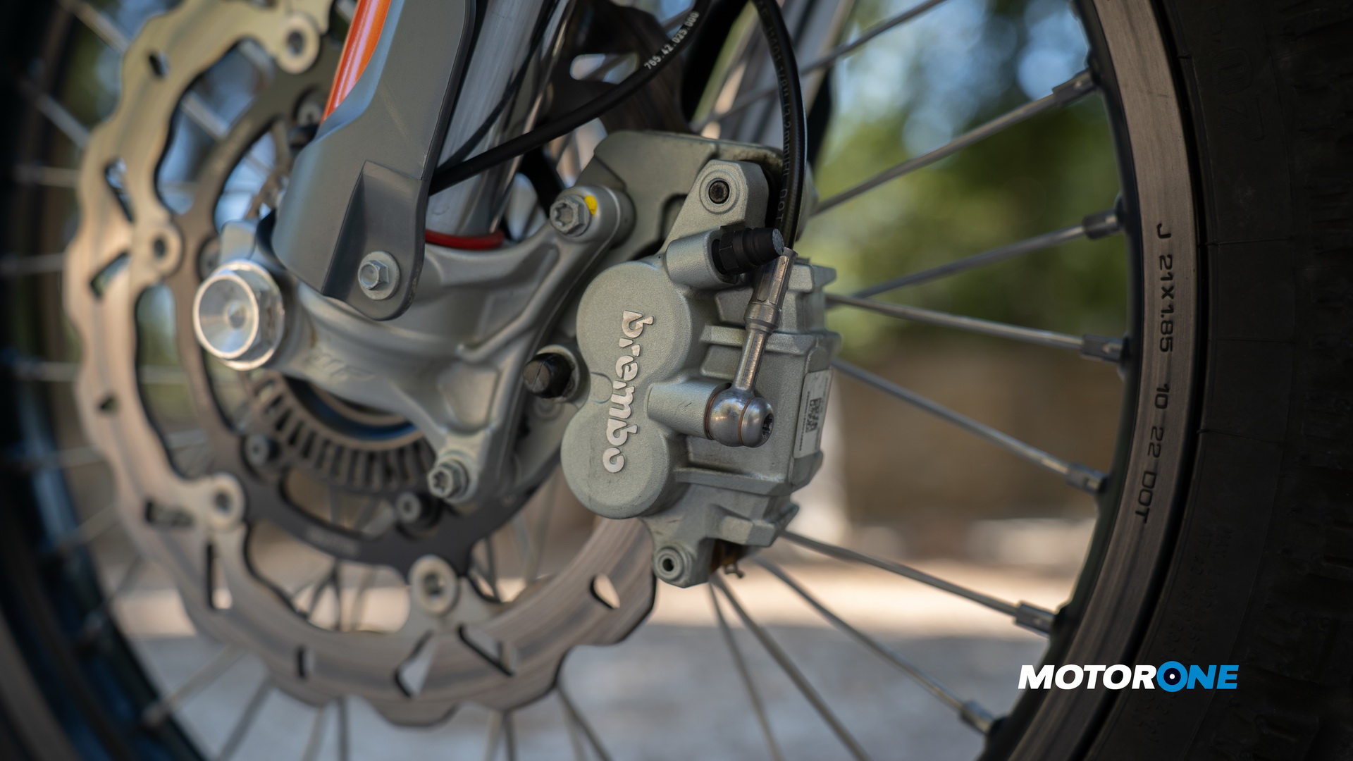 Η παραδοσιακά πορτοκαλί μοτοσυκλέτα της KTM, συνεχίζει τον εντυπωσιακό εξοπλισμό της με προμηθευτές όπως η Brembo για τα – συνοδευόμενα από σωληνάκια υψηλής – φρένα με δίσκους 300 και 240χιλ. εμπρός πίσω, με διπίστονη δαγκάνα και μονοπίστονη αντίστοιχα. Τα δε στεφάνια των τροχών, είναι DID – Dirtstar.