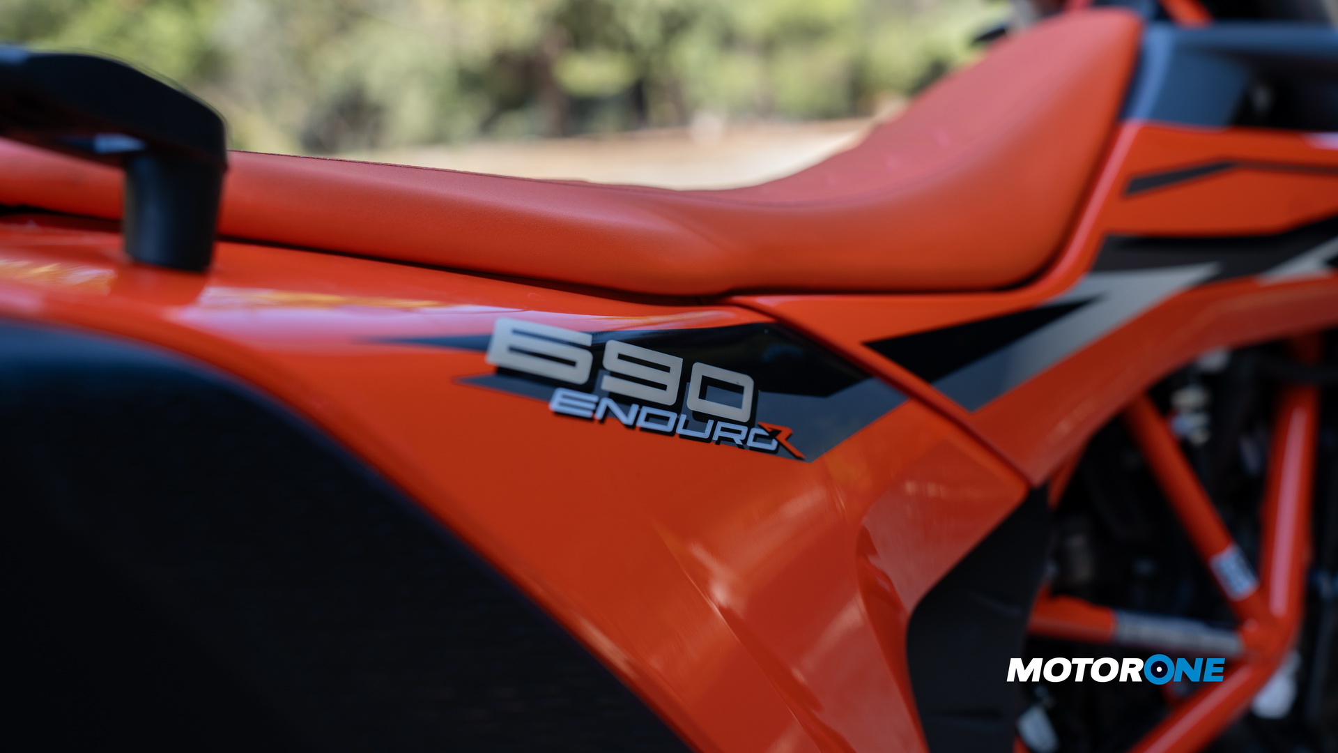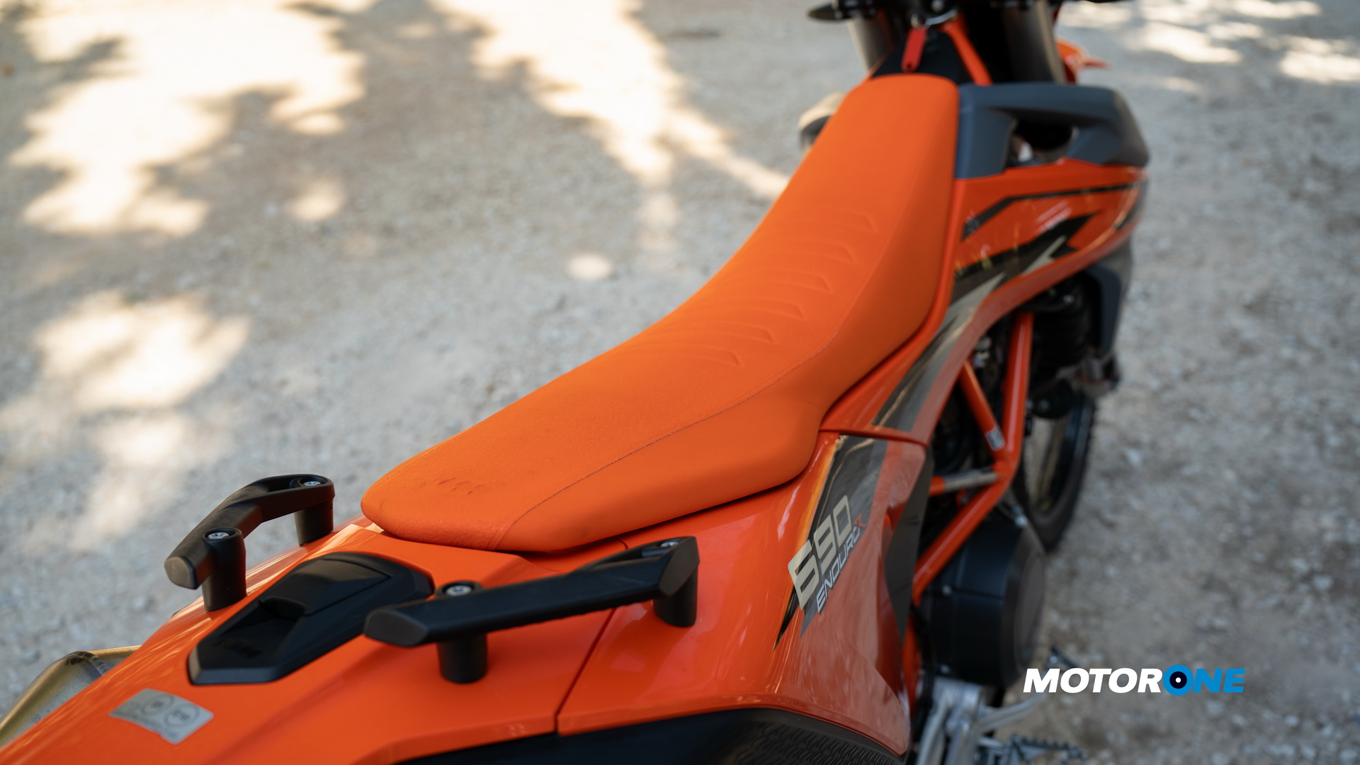 Στην 690 Enduro R η σέλα είναι ψηλά, στα 936 χιλ. είναι στενή και σκληρή, ενώ χωροταξικά θα υποδεχτεί αθλητικούς σωματότυπους, αν θέλουμε να συζητάμε και για μεταφορά συνεπιβάτη. Αν είσαι κάτω του 1,80 μ. ύψος δύσκολα θα νιώσεις την επαφή των ποδιών με το έδαφος βολική, ενώ και το κόψιμο του τιμονιού είναι περιορισμένο. Το πολυόργανο είναι μεν digital, αλλά λιλιπούτιο για να χαρακτηριστεί πίνακας οργάνων. Συναγωνίζεται σε μέγεθος το προφίλ μιας μπάρας δημητριακών, παρόλα αυτά αν τον ψάξεις και δεχτείς τις λεπτές ενδείξεις του, θα βρεις πλήθος πληροφοριών, ακόμα και λειτουργία στροφόμετρου.
