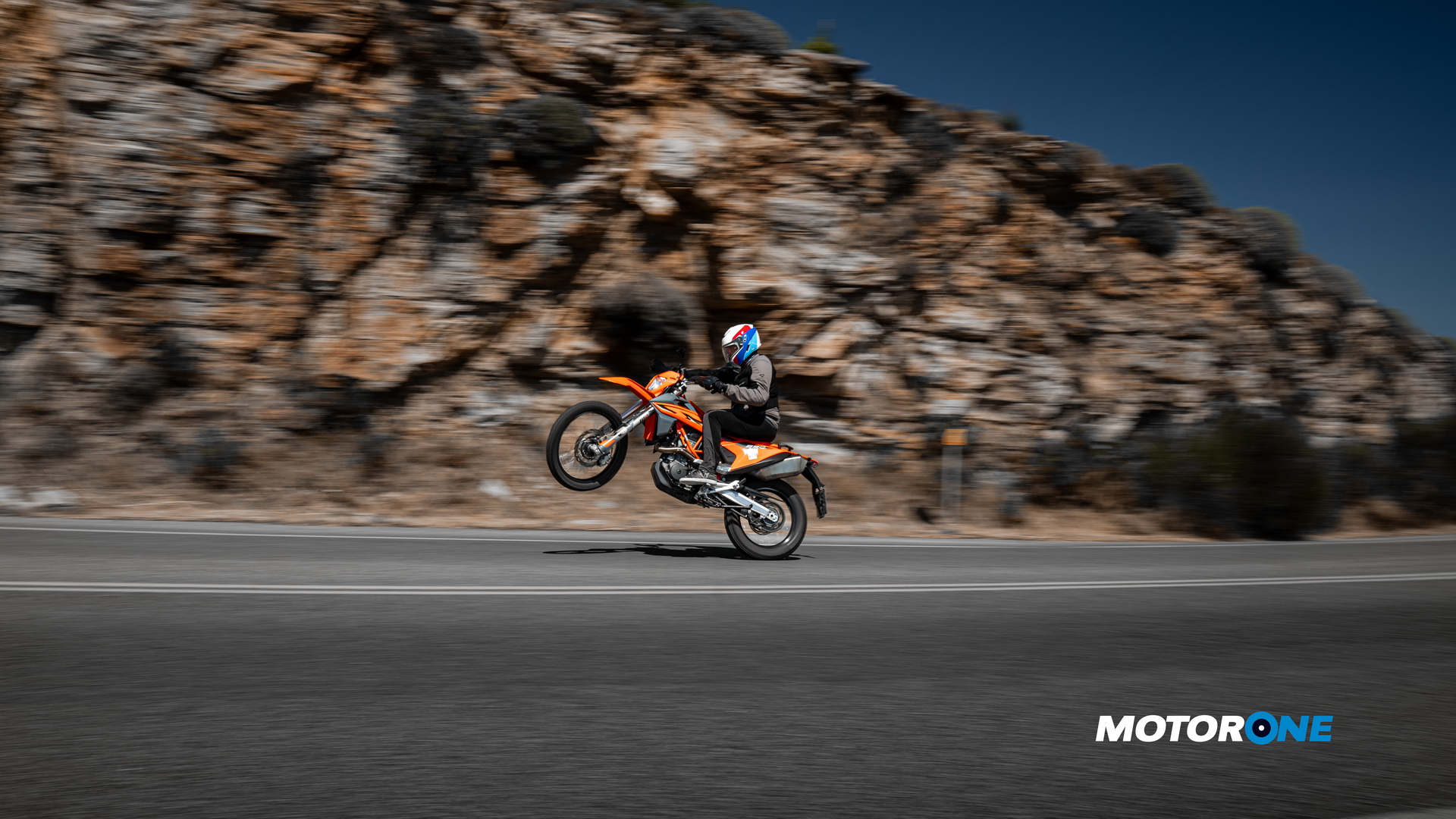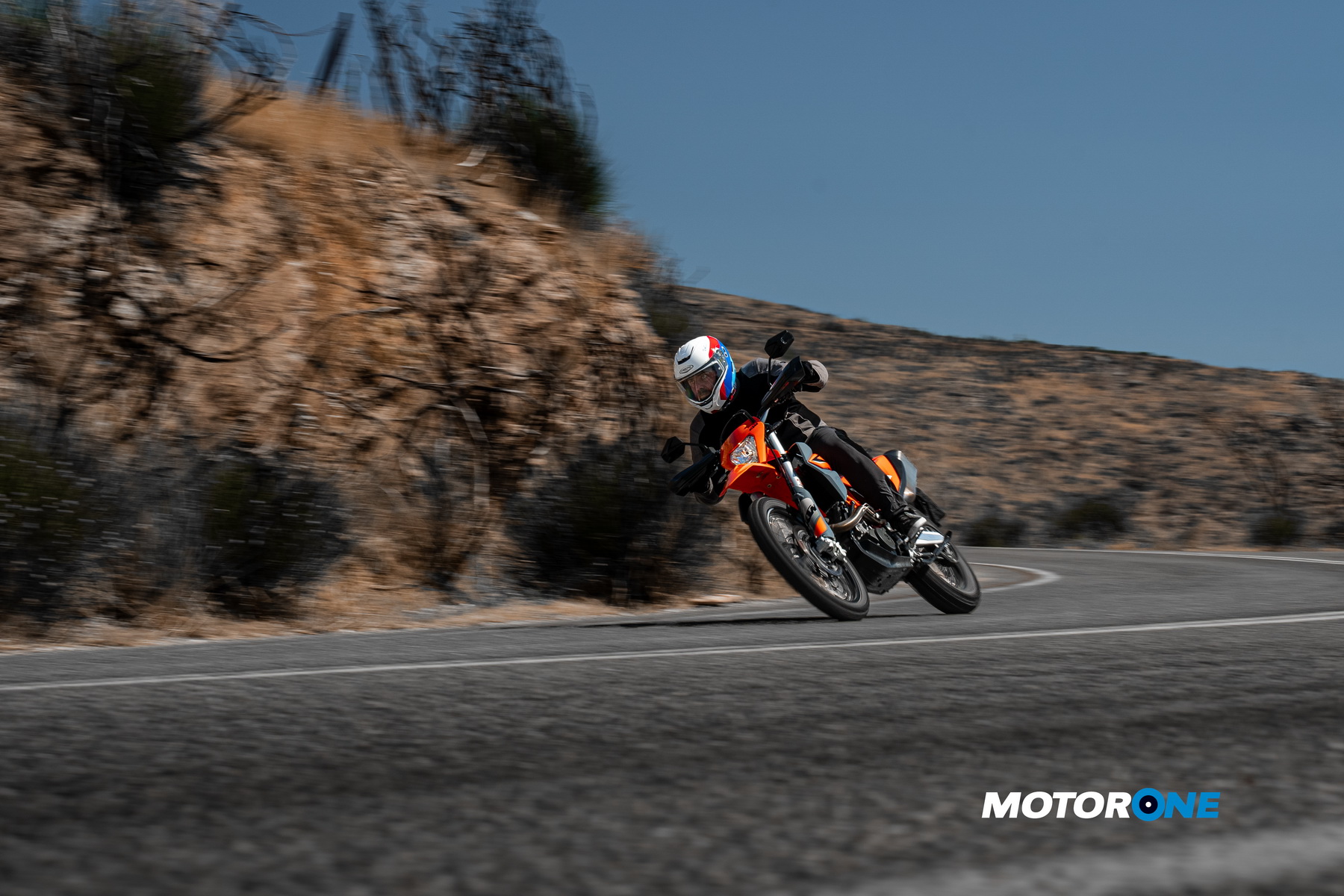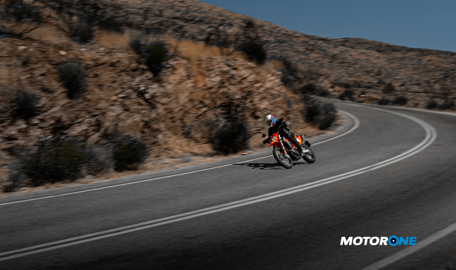 Η ουσία της συμπεριφοράς της όμως είναι μια πανάλαφρη στις αλλαγές κλίσης μοτοσυκλέτα, ένα σοβαρό παιχνίδι που σε προκαλεί για ταρζανιές και σου προσφέρει απόλυτο έλεγχο. Κάτι που προσφέρει σε ακόμα μεγαλύτερο βαθμό απο τη στιγμή που περάσεις στο χώμα, για το οποίο είναι προσανατολισμένη. Το απόλυτο εργαλείο για χώμα βέβαια απαιτεί δύο σημαντικές συνθήκες. Χωμάτινα ελαστικά και μαλακότερες ρυθμίσεις στην ανάρτηση που έτσι κι αλλιώς είναι σφιχτή και ζητάει επιθετικό και γνώστη αναβάτη στη σέλα του (ή καλύτερα, όρθιο στα μασπιέ της).