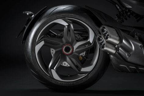 Οι έντονα σμιλευμένες γραμμές στο ρεζερβουάρ και σε άλλα εξαρτήματα της μοτοσυκλέτας θυμίζουν το μυώδες αμάξωμα της Batur, ενώ οι εισαγωγές αέρα ένθεν και ένθεν είναι δίχρωμες, και μοτίβο μάσκας όπως ακριβώς και της Batur. Οι σφυρήλατες ζάντες που έχουν επίσης σχεδιαστεί και κατασκευαστεί αποκλειστικά για αυτή τη συνεργασία, μοιάζουν πανομοιότυπες με αυτές του εξαιρετικά αποκλειστικού GT αυτοκινήτου, και είναι βαμμένες σε Dark Titanium Satin, με κάποιες επεξεργασμένες επιφάνειες να παραμένουν ορατές.