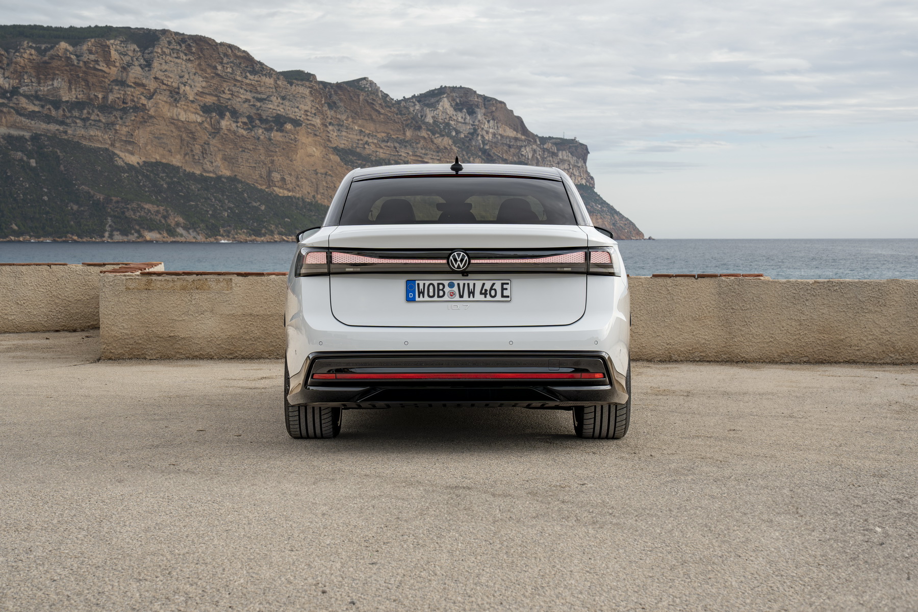 Αυτό επιβεβαιώνεται με ενα εντυπωσιακό Cd 0,23 που είναι ο καλύτερος συντελεστής οπισθέλκουσας σε ολόκληρη την οικογένεια ID. ηλεκτρικών αυτοκινήτων της Volkswagen. Οι αναλογίες του πρακτικά δημιουργούν μια κομψή και δυναμική εντύπωση από το πλάι και φανερώνουν σχετικά κοντούς πρόβολους και ένα μεγάλο μεταξόνιο στα 2.971 χιλ.. Η τρισδιάστατη σχεδίαση του καπό με τους LED προβολείς και η στενή λωρίδα LED για τα φώτα ημέρας είναι χαρακτηριστικό της οικογένειας ID. όπως συμβαίνει και με την αντίστοιχη φωτεινή λωρίδα LED πίσω, που γεφυρώνει τα επίσης LED φωτιστικά σώματα.