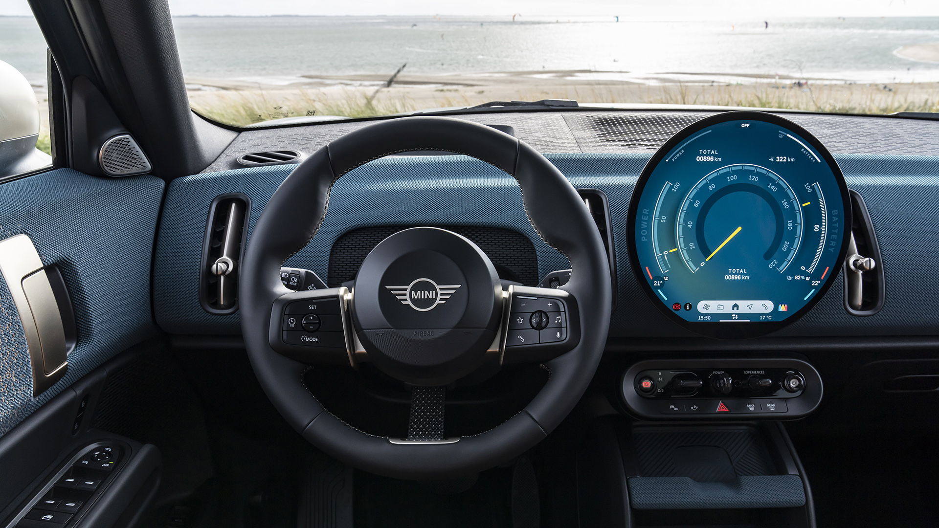 Με την πανοραμική γυάλινη οροφή, το εσωτερικό είναι ιδιαίτερα φωτεινό και φιλόξενο. Σημαντική είναι η δυνατότητα μετακίνησης της 2ης σειράς καθισμάτων κατά 130 χλστ., ενώ μπορεί παράλληλα να ρυθμιστεί η κλίση της πλάτης κατά 12 μοίρες. Όσο για τον χώρο αποσκευών, για το Countryman Electric ξεκινάει από τα 460 λίτρα και φτάνει τα 1.450 λίτρα. Οι τέσσερες ανανεωμένες επενδύσεις αποτυπώνουν τη σύγχρονη φιλοσοφία του εσωτερικού σε διάφορες μορφές.