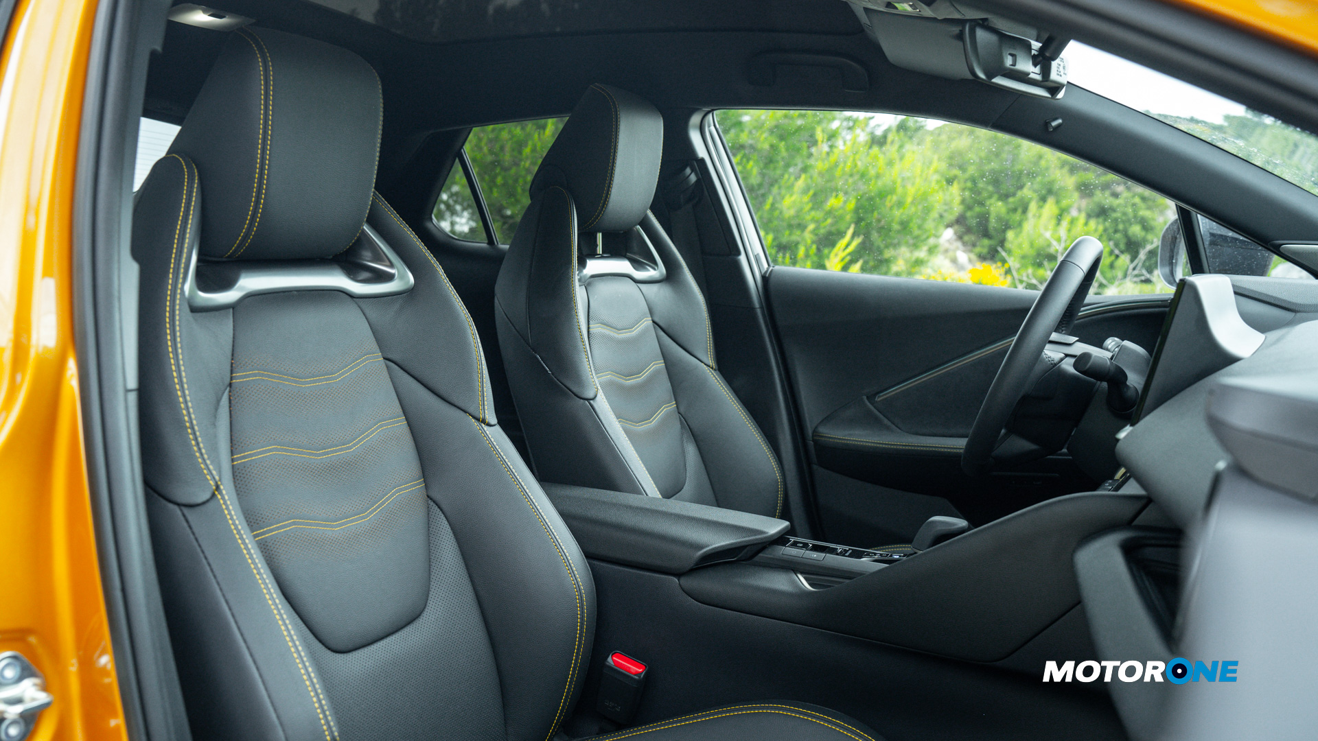 Το εσωτερικό είναι φυσικά πλουσιότερο, καθώς έχει στάνταρ δερμάτινα διάτρητα καθίσματα με ραφές αντίθεσης στην ίδια απόχρωση Sulphur, head-up display, πανοραμική ηλιοροφή και ηχοσύστημα της JBL με 9 ηχεία.