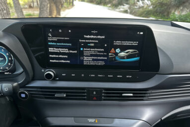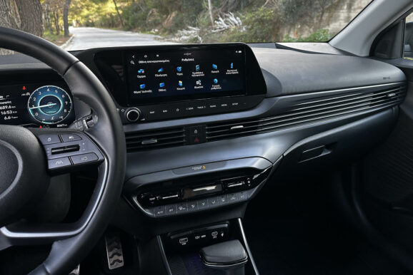 Στις 10,25 ίντσες είναι και η διαγώνιος της κεντρικής οθόνης αφής, η οποία έχει απλά γραφικά και είναι κάπως αργή στην απόκριση. Στη βάση της κεντρικής κονσόλας υπάρχει θέση επαγωγικής φόρτισης smartphone, αλλά η σύνδεση με Apple CarPlay και Android Auto γίνεται μόνο ενσύρματα, μέσω θύρας USB-A. Μία θύρα USB-C εμπρός και μία πίσω καλύπτουν τις ανάγκες ταχείας φόρτισης ηλεκτρονικών συσκευών.