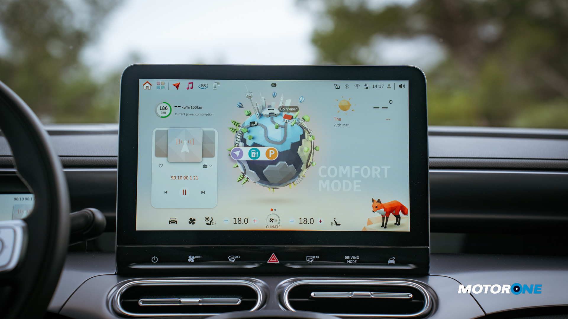 Εντύπωση προκαλεί η υπερυψωμένη κονσόλα, ενώ στο κέντρο του ταμπλό δεσπόζει η μεγάλη οθόνη αφής 12,8 ιντσών. Αρχικά σε αγχώνει ελαφρώς με τις διάσπαρτες ενδείξεις και επιλογές στην αρχική σελίδα και η αλήθεια είναι πως χρειάζεσαι λίγο χρόνο για να περιηγηθείς και να εξοικειωθείς με το μενού και την πληθώρα λειτουργιών που συγκεντρώνει.