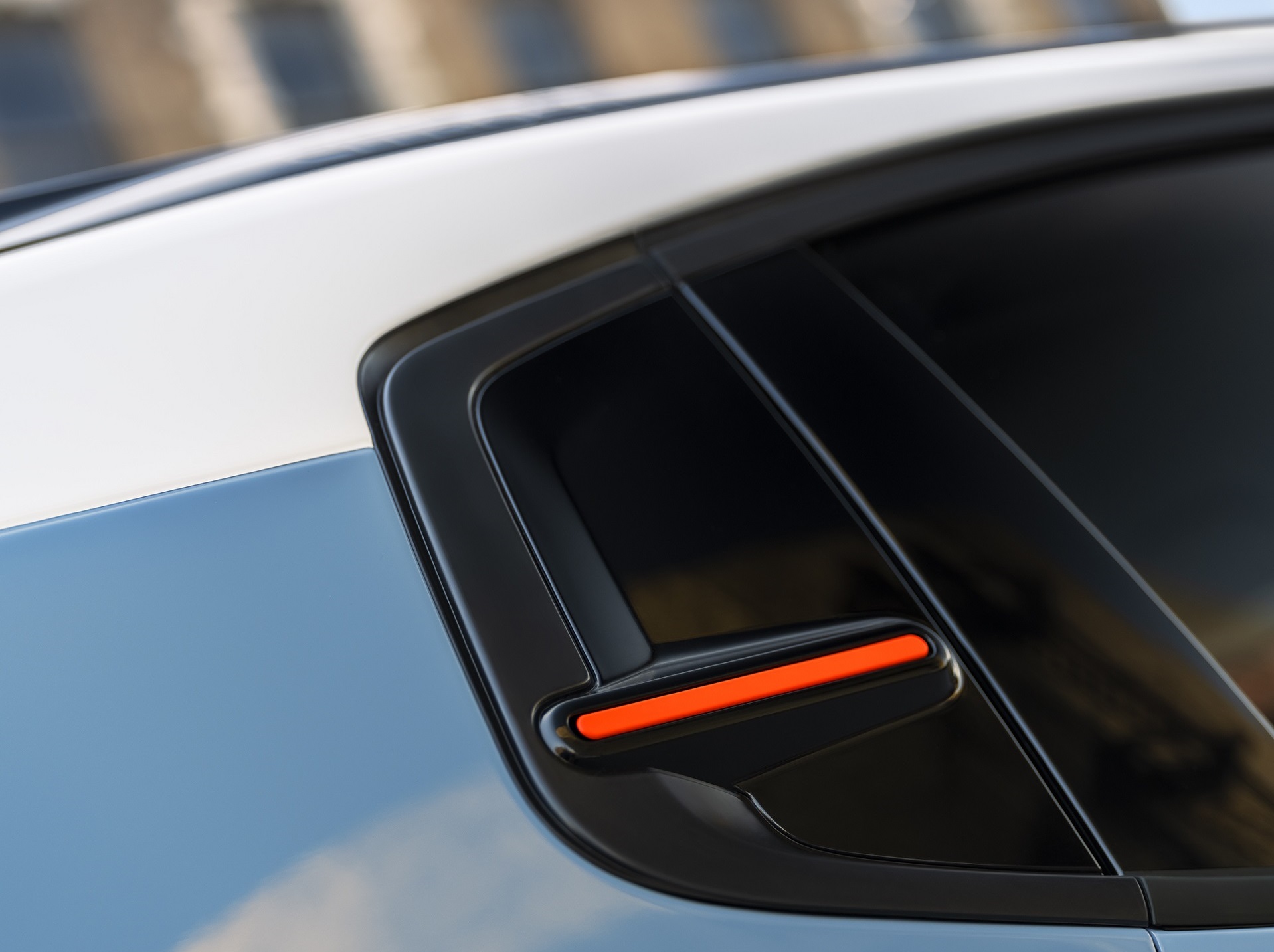 Μία χρωματιστή διακοσμητική οριζόντια γραμμή στις εισαγωγές αέρα της εμπρός μάσκας, που συναντάται και στην τρίτη κολώνα δίνει έναν ξεχωριστό τόνο στη χρωματική αντίθεση γαλάζιου (Monte Carlo Blue) αμαξώματος με λευκή οροφή που διέθετε το αυτοκίνητο το οποίο οδηγήσαμε και είναι ένα από τα έξι διαθέσιμα χρώματα.
