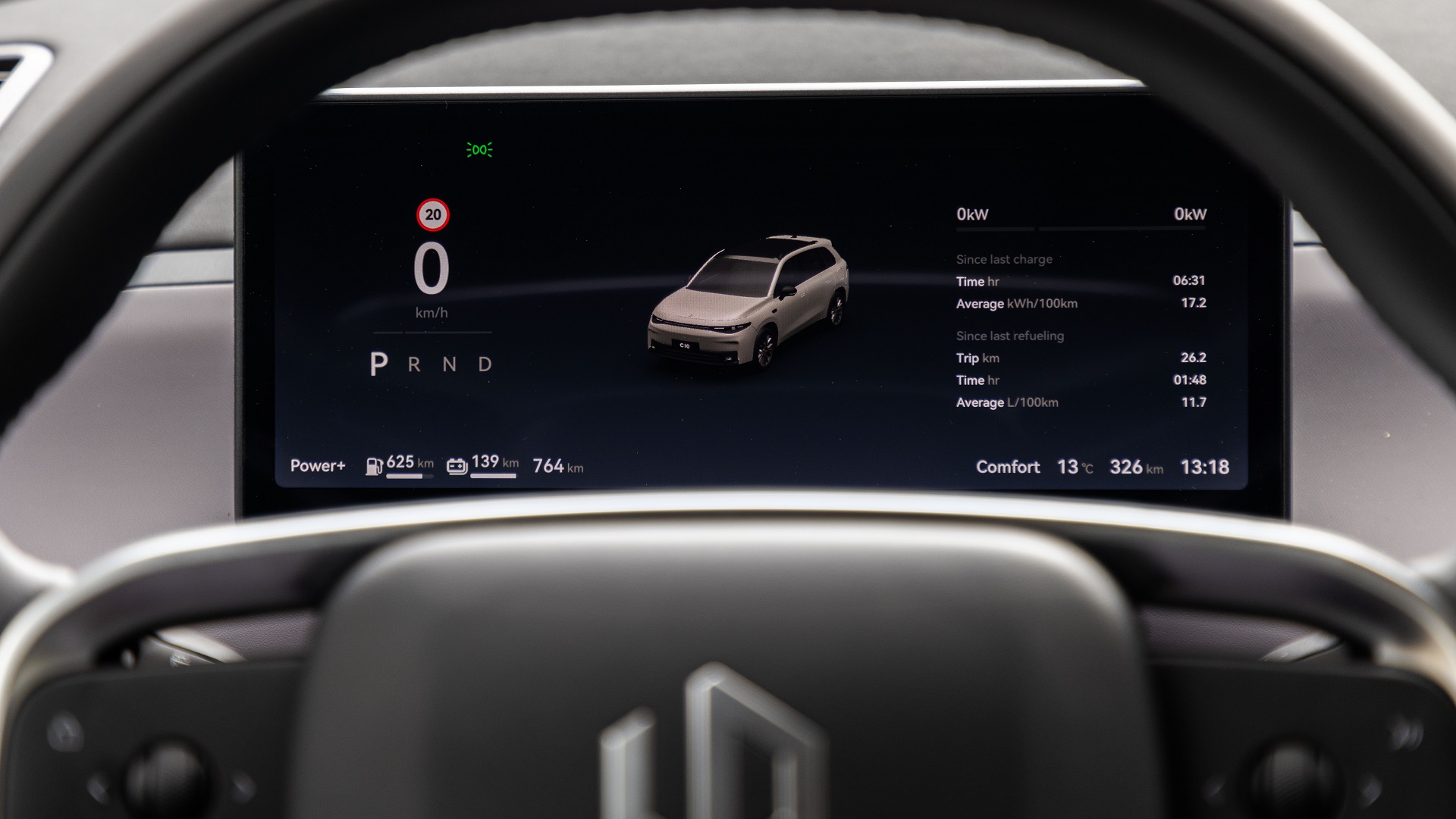 Η απόδοση φτάνει τους 215 ίππους και τα 320 Nm ροπής, αναπτύσσεται γραμμικά και εξασφαλίζει καλές επιδόσεις στο D-SUV της Leapmotor: 0-100 χλμ./ώρα σε 8,5’’ και τελική ταχύτητα 170 χλμ./ώρα. Παράλληλα, η κατανάλωση καυσίμου περιορίζεται σε μόλις 0,4 λτ./100 χλμ. αν ο οδηγός φροντίζει να φορτίζει τη μπαταρία, ενώ ακόμη και όταν αυτή αδειάσει οι τιμές που θα βλέπει στο trip computer κυμαίνονται στα 5 με 6 λτ./100 χλμ.