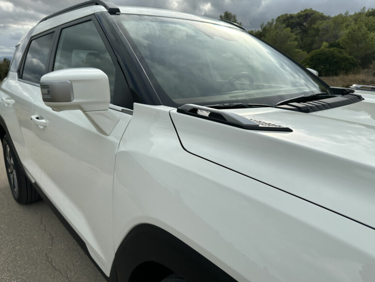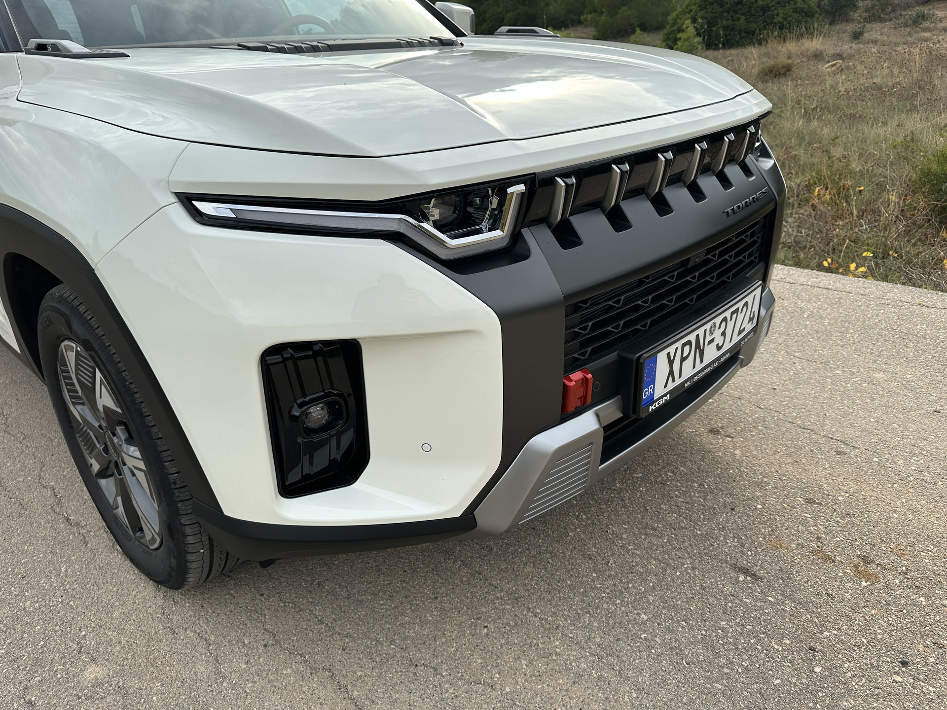 Εμφανισιακά, η KGM έχει επιλέξει έντονες γωνίες για το Torres, με τη λεπτή μάσκα με κάθετες γρίλιες και το φουσκωμένο στα άκρα του καπό το κάνουν να ξεχωρίζει στο εμπρός μέρος. To χαρακτηριστικό που σου μένει όμως, είναι τα καλύμματα για τις βάσεις ρυμούλκησης που βρίσκονται στα πλαϊνά του πίσω μέρους του καπό και θυμίζουν χειρολαβές.