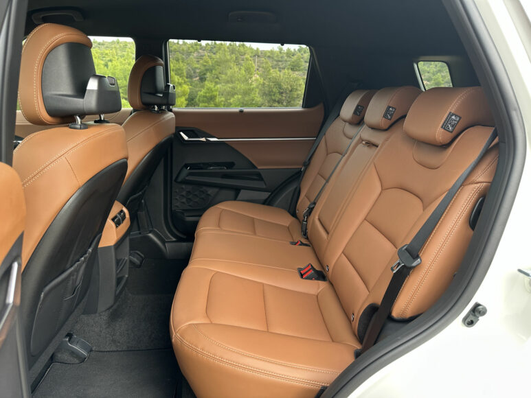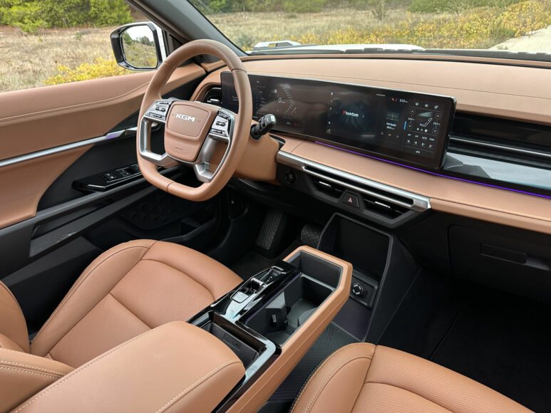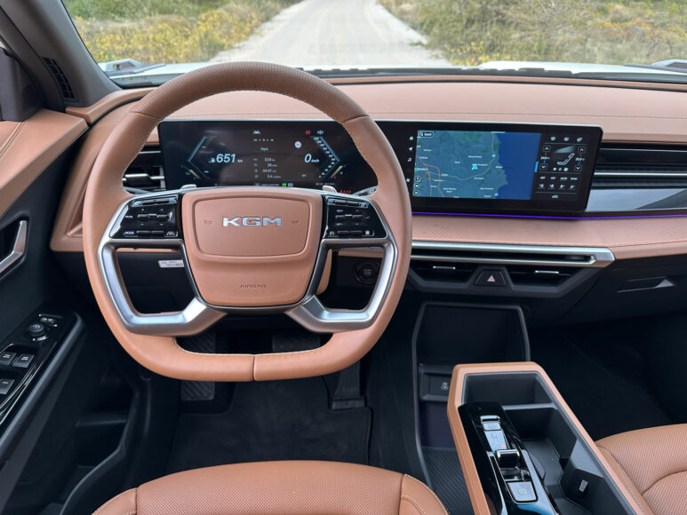 Εμείς είχαμε στη διάθεσή μας το KGM Torres Hybrid στο επίπεδο εξοπλισμού Club Plus, το οποίο βρίσκεται ένα σκαλοπάτι πριν από την κορυφαία έκδοση Platinum, και προσθέτει διάφορα καλούδια που συναντάς συνήθως σε premium αυτοκίνητα υψηλότερου budget, όπως δερμάτινο σαλόνι, με αεριζόμενα εμπρός καθίσματα και θερμαινόμενα πίσω.