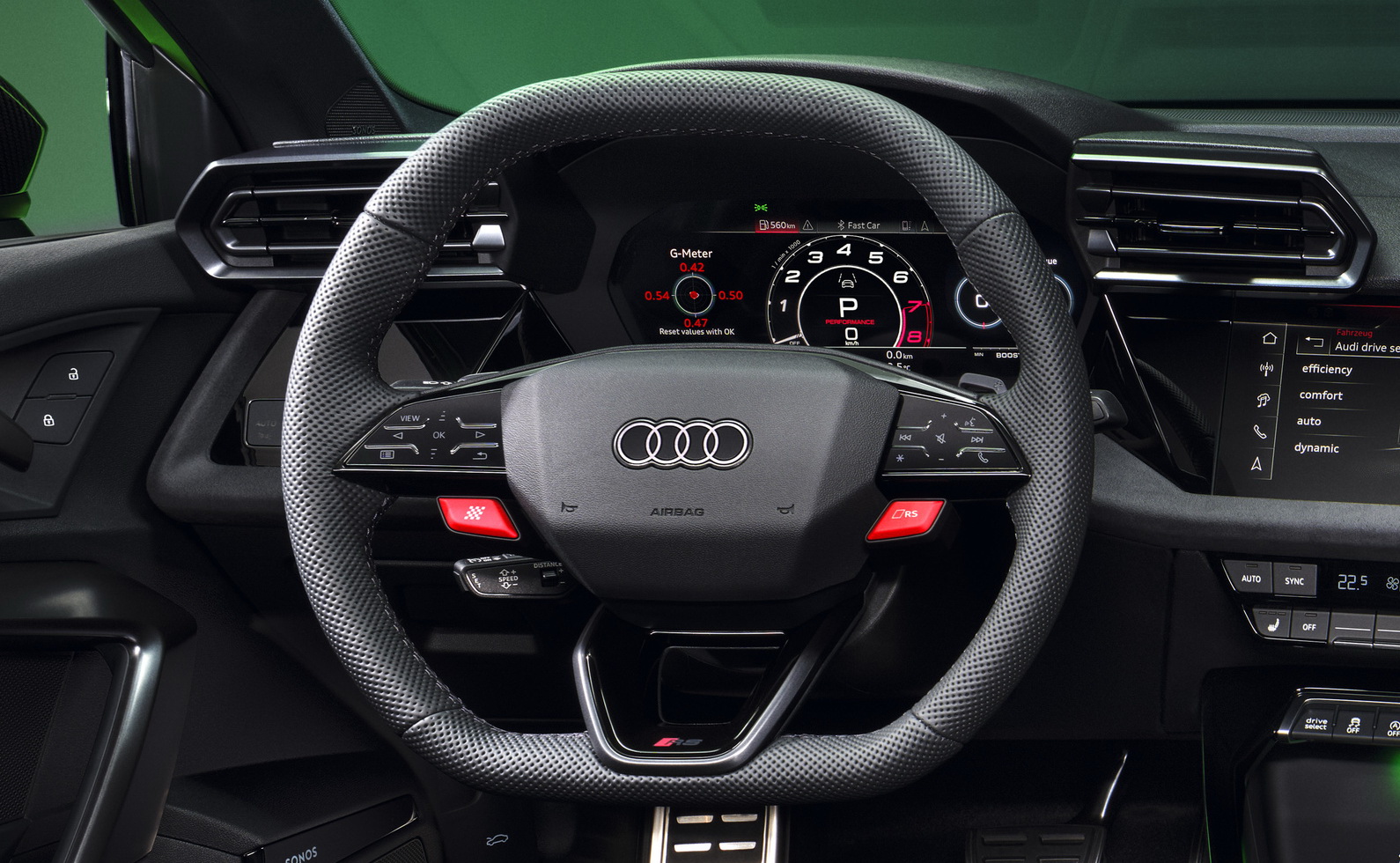 Αντίστοιχη είναι η εικόνα στο εσωτερικό. Τα μπάκετ καθίσματα με ενσωματωμένα προσκέφαλα, ο ψηφιακός πίνακας οργάνων Virtual Cockpit Plus 12,3’’ με έξτρα ενδείξεις όπως οι πλευρικές δυνάμεις G και οι χρόνοι επιτάχυνσης και γύρου, αλλά και το καινούριο flat-bottom τιμόνι με τα κόκκινα μπουτόν για τα πιο σπορ driving modes (RS και RS Individual), σου θυμίζουν ότι βρίσκεσαι μέσα σε κάτι ξεχωριστό.