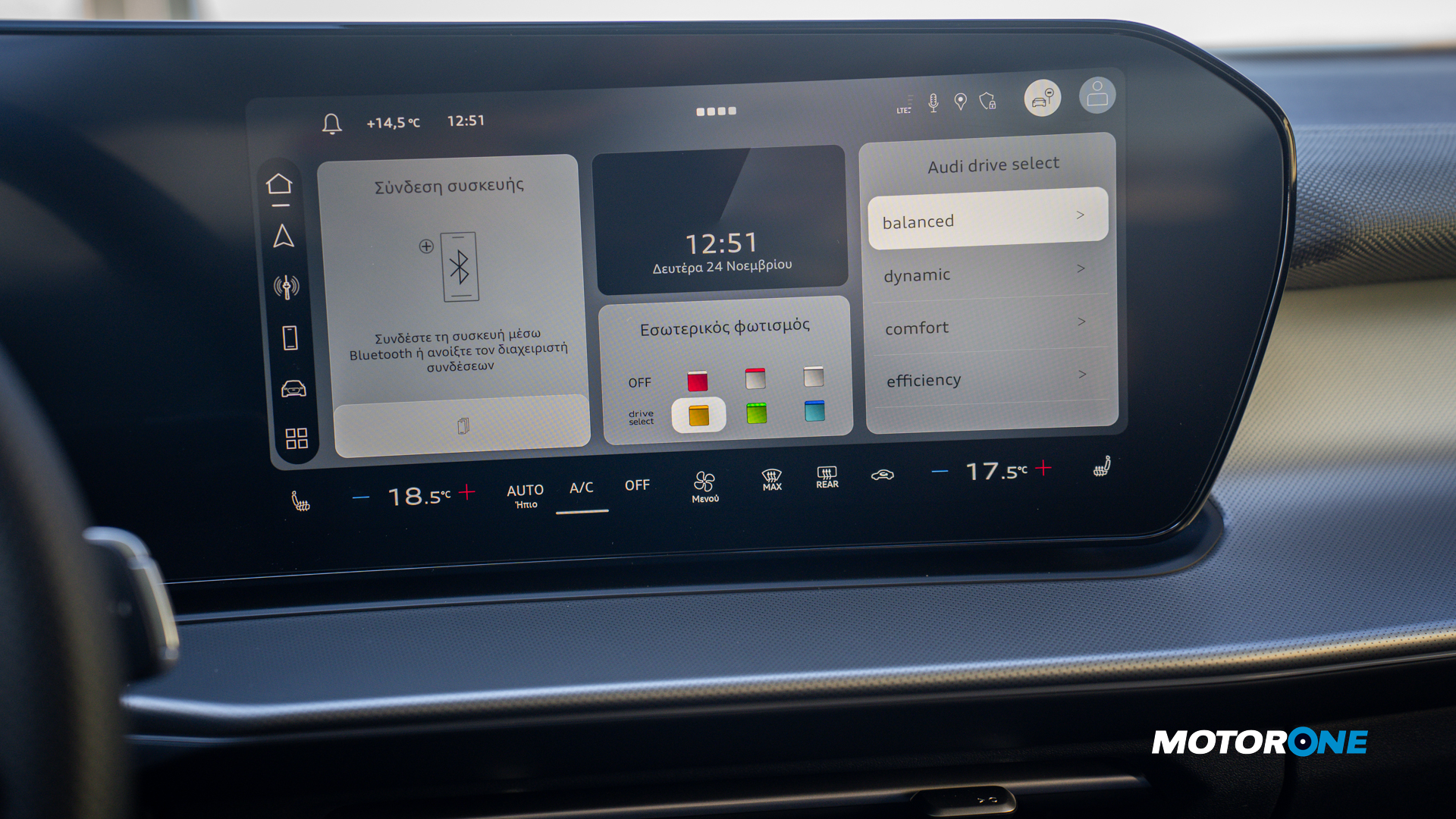Τα τέσσερα διαφορετικά προγράμματα άλλωστε στο Dynamic Select (Efficiency, Balanced, Comfort, Dynamic) φροντίζουν για την προσαρμογή του αυτοκινήτου στα δεδομένα της χρήσης. Η υβριδική τεχνολογία και το σύστημα απενεργοποίησης κυλίνδρων, ωφελούν την κατανάλωση με την Audi να ανακοινώνει μόλις 6,2 λτ./100 χλμ., εφικτά με ολοήμερη σύνεση και ελαφρύ πόδι, ενώ περίπου 3 λίτρα επιπλέον υπολογίζεις όταν απελευθερώνεσαι προς τις επιδόσεις. Κάπου ανάμεσα υπολογίζεις και την μέση κατανάλωση.