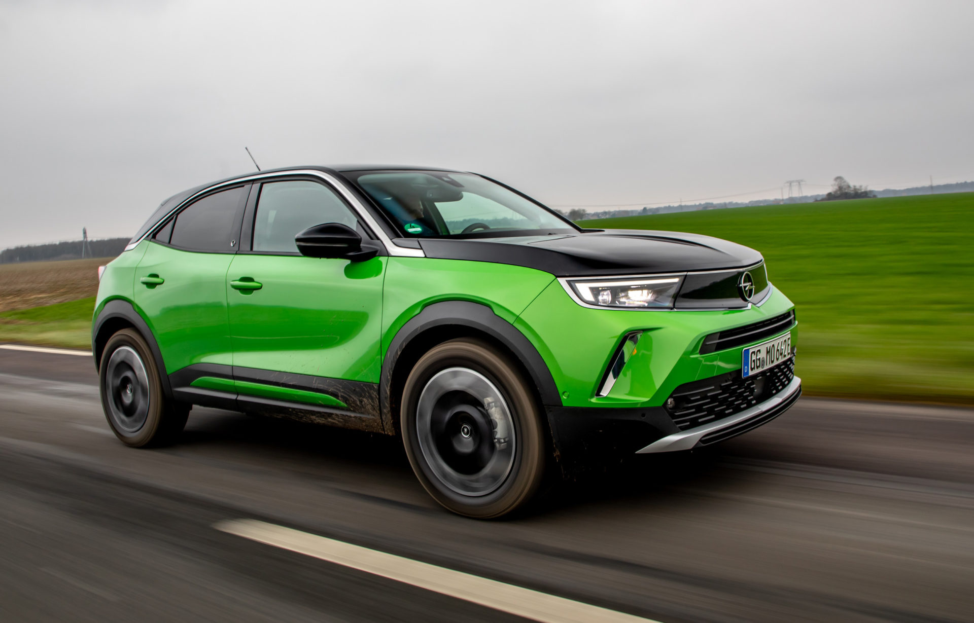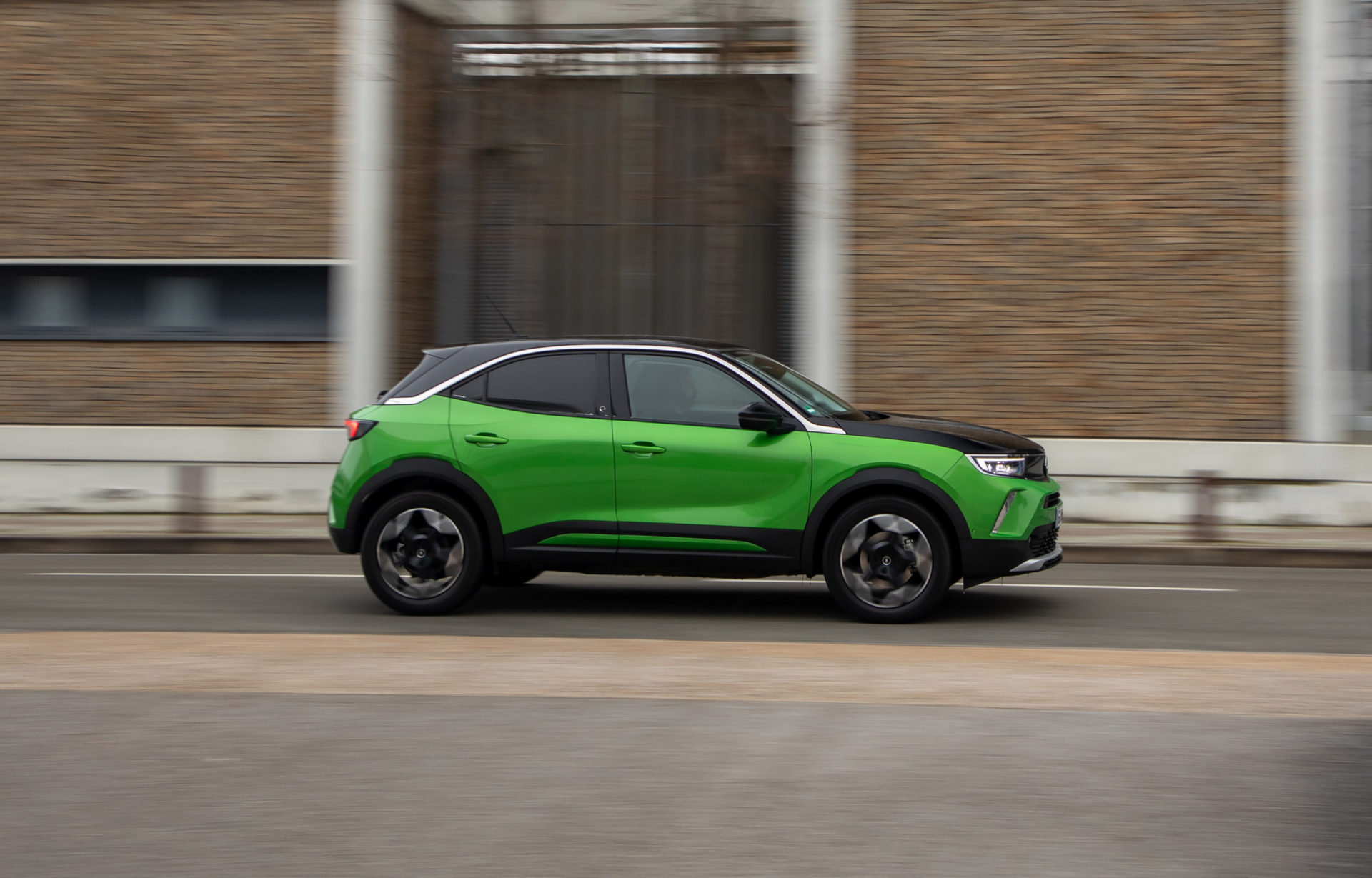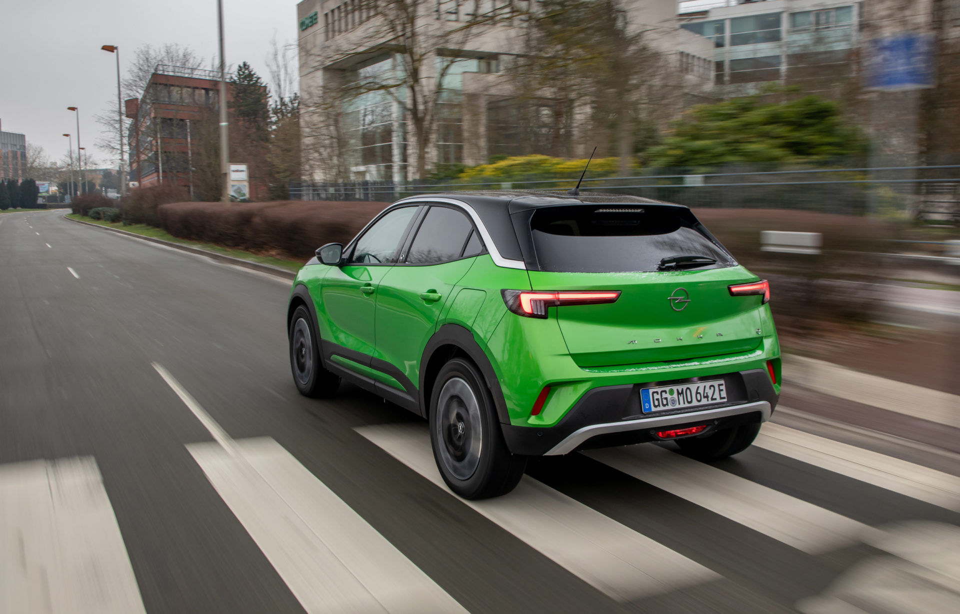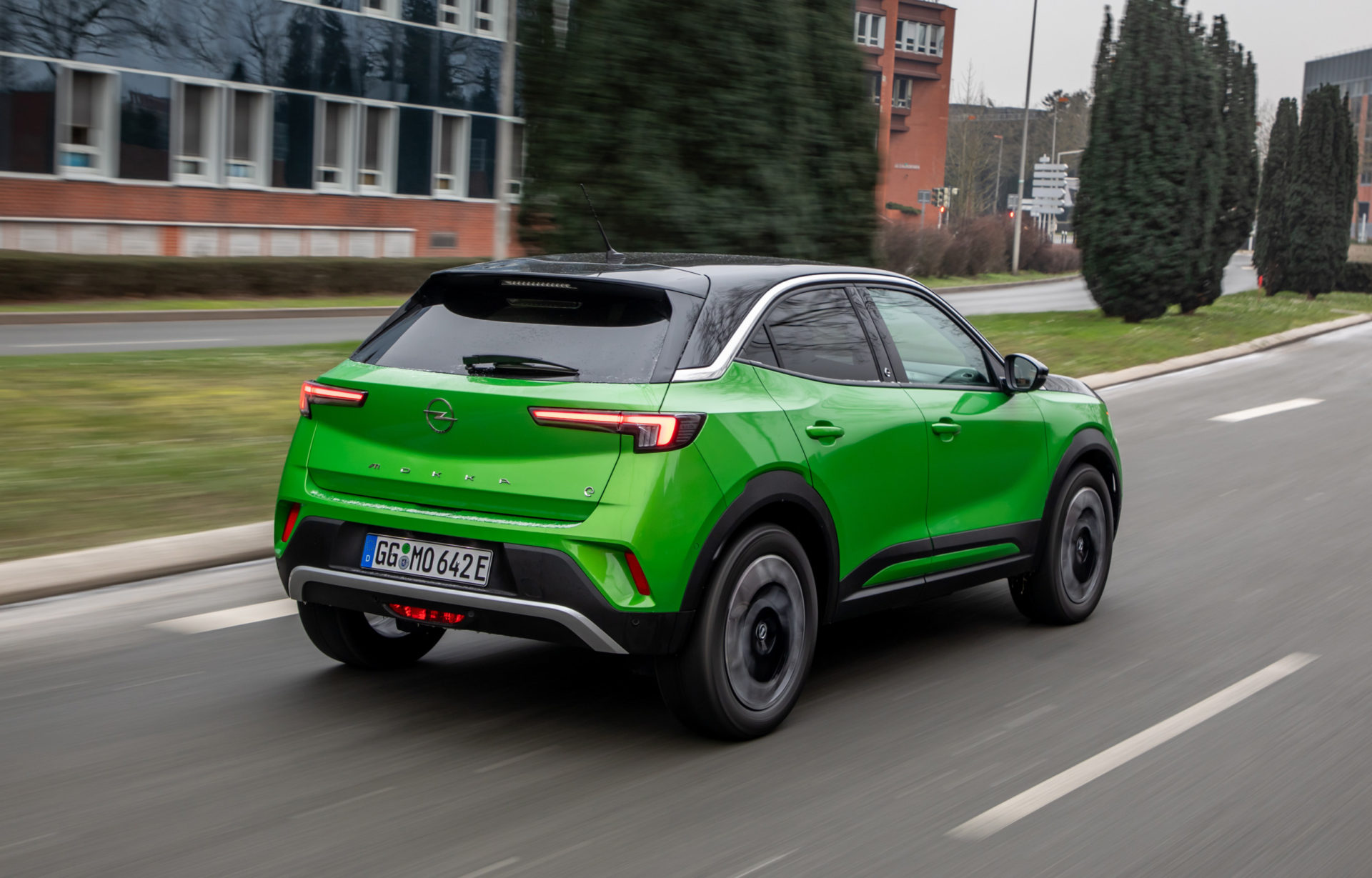 Στο αυτοκίνητο της δοκιμής, με τις γερμανικές πινακίδες, το έντονο πράσινο κάνει αντίθεση με το μαύρο σε καπό-οροφή, συνδυασμός που τραβά ακόμη περισσότερο τα βλέμματα. Περίγραμμα από χρώμιο έχει χρησιμοποιηθεί στη μάσκα, αλλά και στο τόξο, πάνω από τα πλαϊνά παράθυρα, ενώ το λογότυπο «e» που εμφανίζεται στις μεσαίες κολώνες και την πόρτα του χώρου αποσκευών, αποτελεί την ένδειξη ότι έχουμε μπροστά μας την ηλεκτρική έκδοση του Mokka.