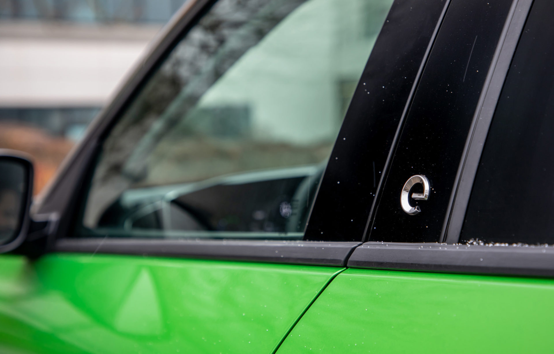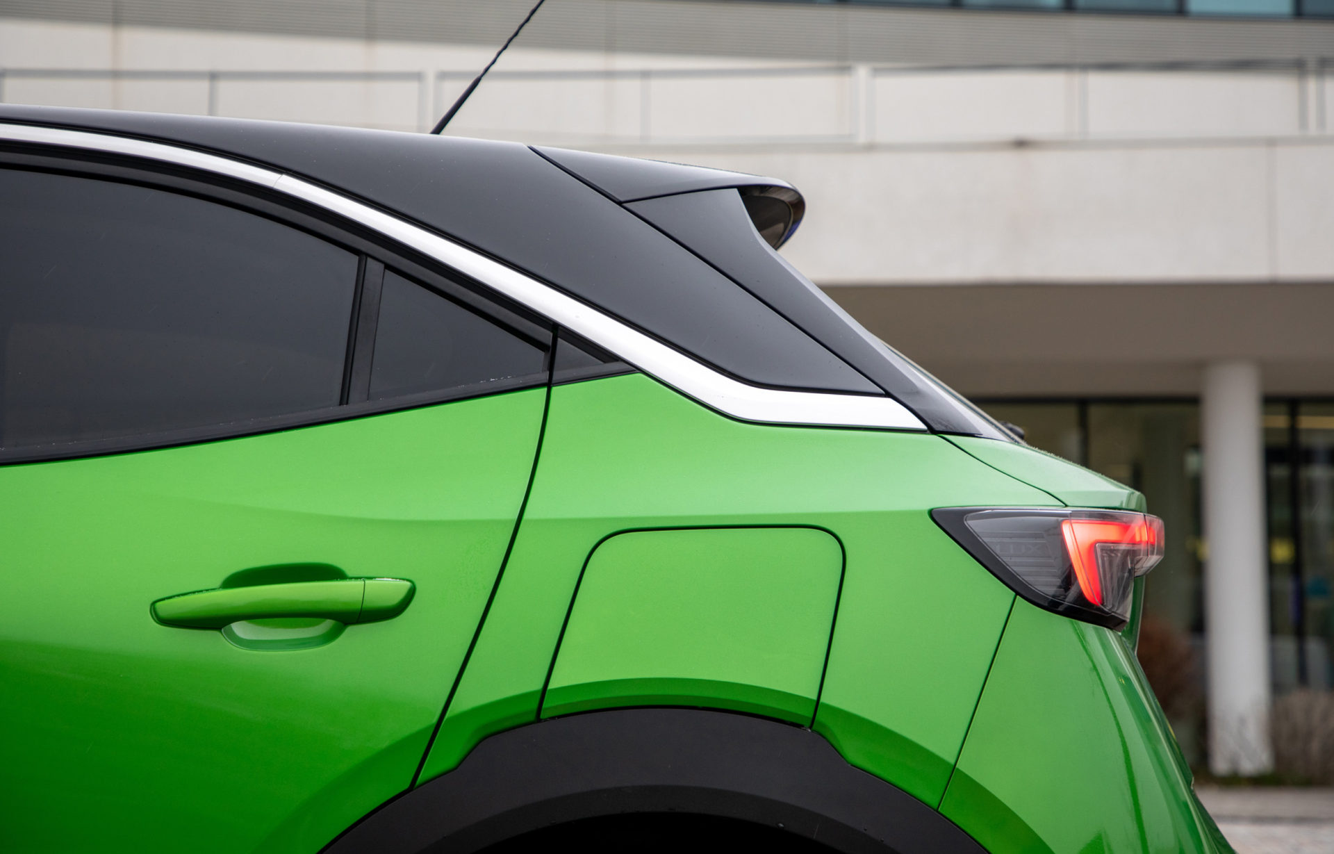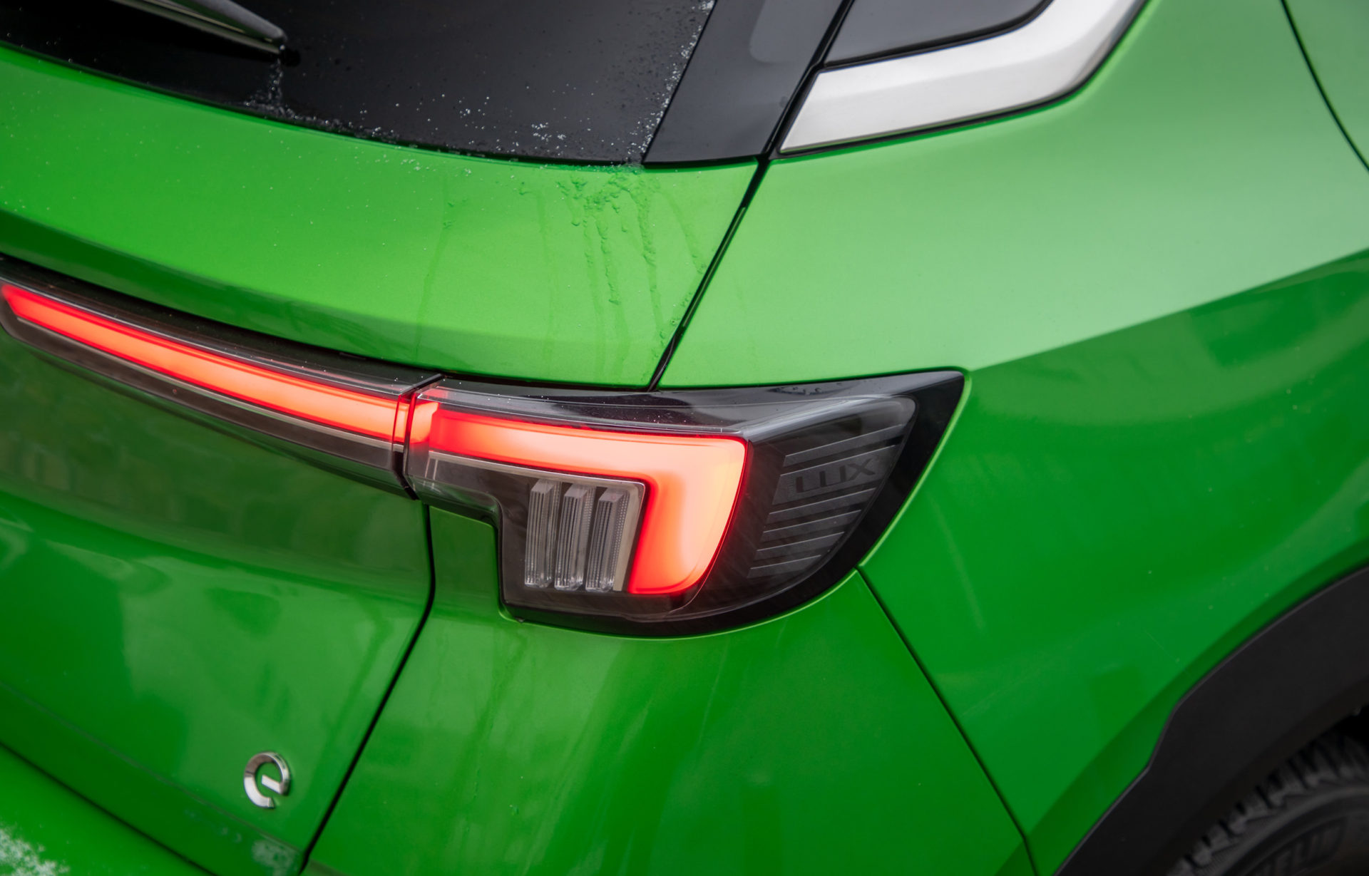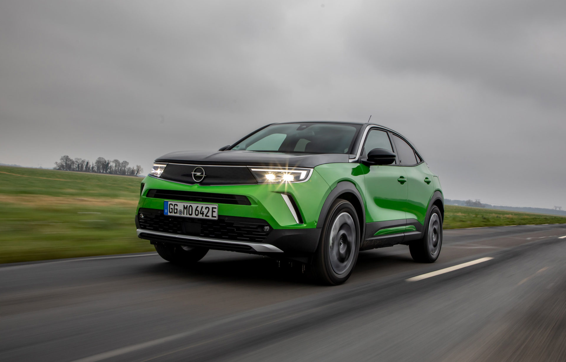 Στο αυτοκίνητο της δοκιμής, με τις γερμανικές πινακίδες, το έντονο πράσινο κάνει αντίθεση με το μαύρο σε καπό-οροφή, συνδυασμός που τραβά ακόμη περισσότερο τα βλέμματα. Περίγραμμα από χρώμιο έχει χρησιμοποιηθεί στη μάσκα, αλλά και στο τόξο, πάνω από τα πλαϊνά παράθυρα, ενώ το λογότυπο «e» που εμφανίζεται στις μεσαίες κολώνες και την πόρτα του χώρου αποσκευών, αποτελεί την ένδειξη ότι έχουμε μπροστά μας την ηλεκτρική έκδοση του Mokka.