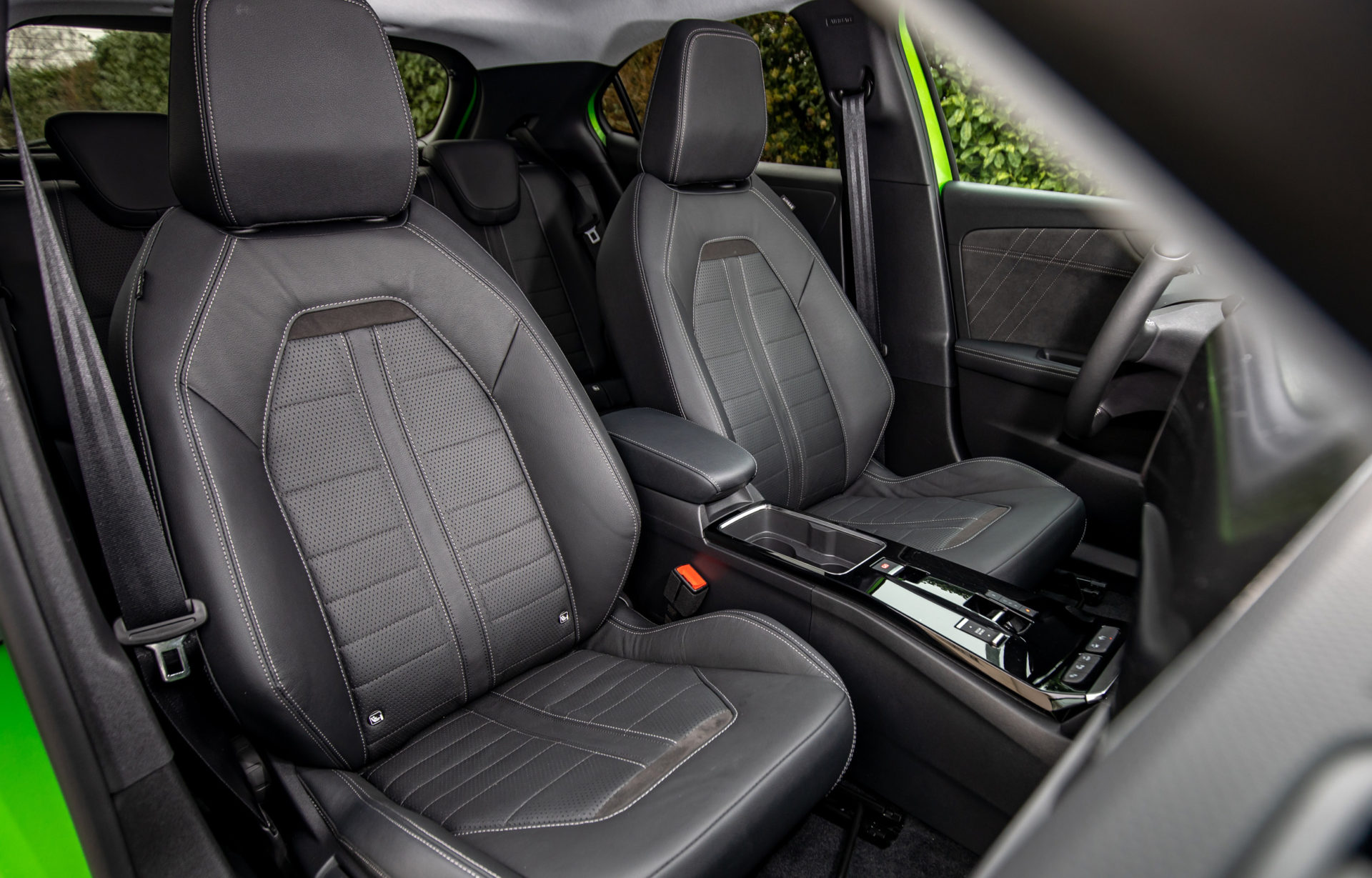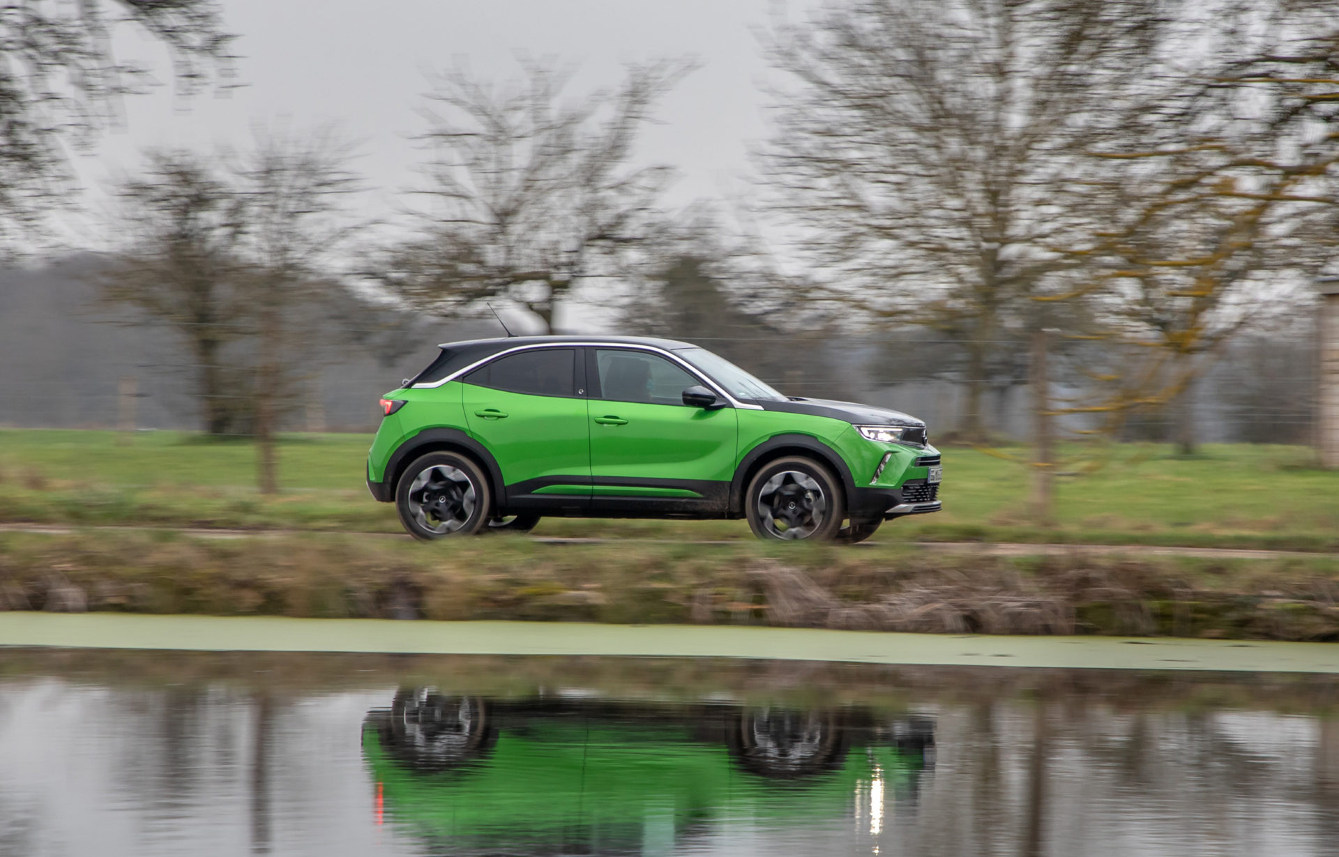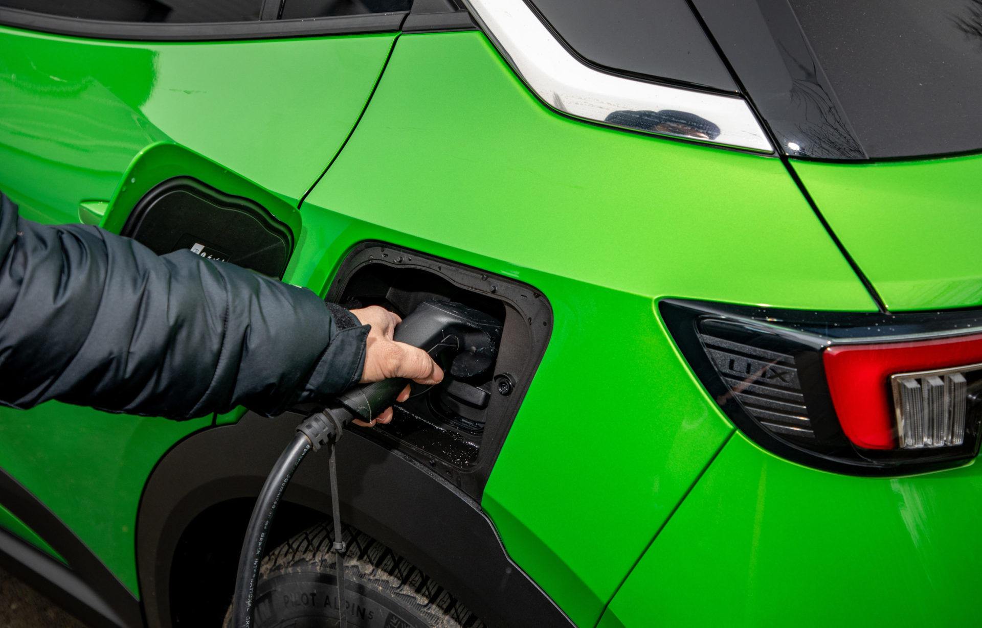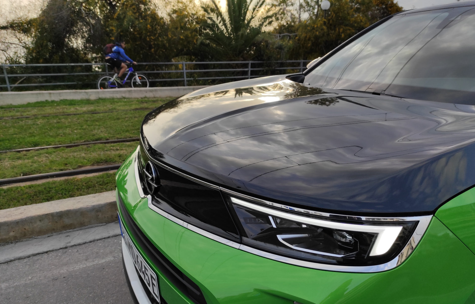 Στο αυτοκίνητο της δοκιμής, με τις γερμανικές πινακίδες, το έντονο πράσινο κάνει αντίθεση με το μαύρο σε καπό-οροφή, συνδυασμός που τραβά ακόμη περισσότερο τα βλέμματα. Περίγραμμα από χρώμιο έχει χρησιμοποιηθεί στη μάσκα, αλλά και στο τόξο, πάνω από τα πλαϊνά παράθυρα, ενώ το λογότυπο «e» που εμφανίζεται στις μεσαίες κολώνες και την πόρτα του χώρου αποσκευών, αποτελεί την ένδειξη ότι έχουμε μπροστά μας την ηλεκτρική έκδοση του Mokka.