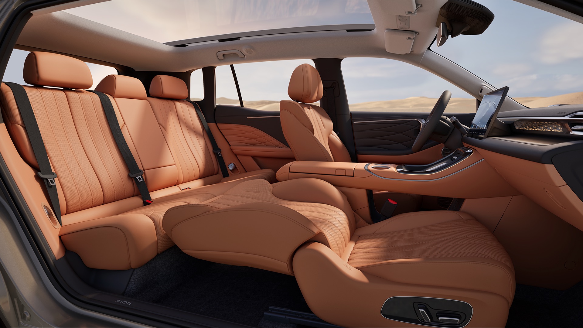 Τέλος, για όσους κάθονται πίσω από τον συνοδηγό, υπάρχει ένα αναδιπλούμενο τραπεζάκι (έκδοση luxury) στην πλάτη του καθίσματος, ιδανικό για να τοποθετήσετε ένα tablet ή να εργαστείτε στο laptop σας, ενισχύοντας τον χαρακτήρα του “κινητού γραφείου” που μπορεί να προσφέρει το AION V.